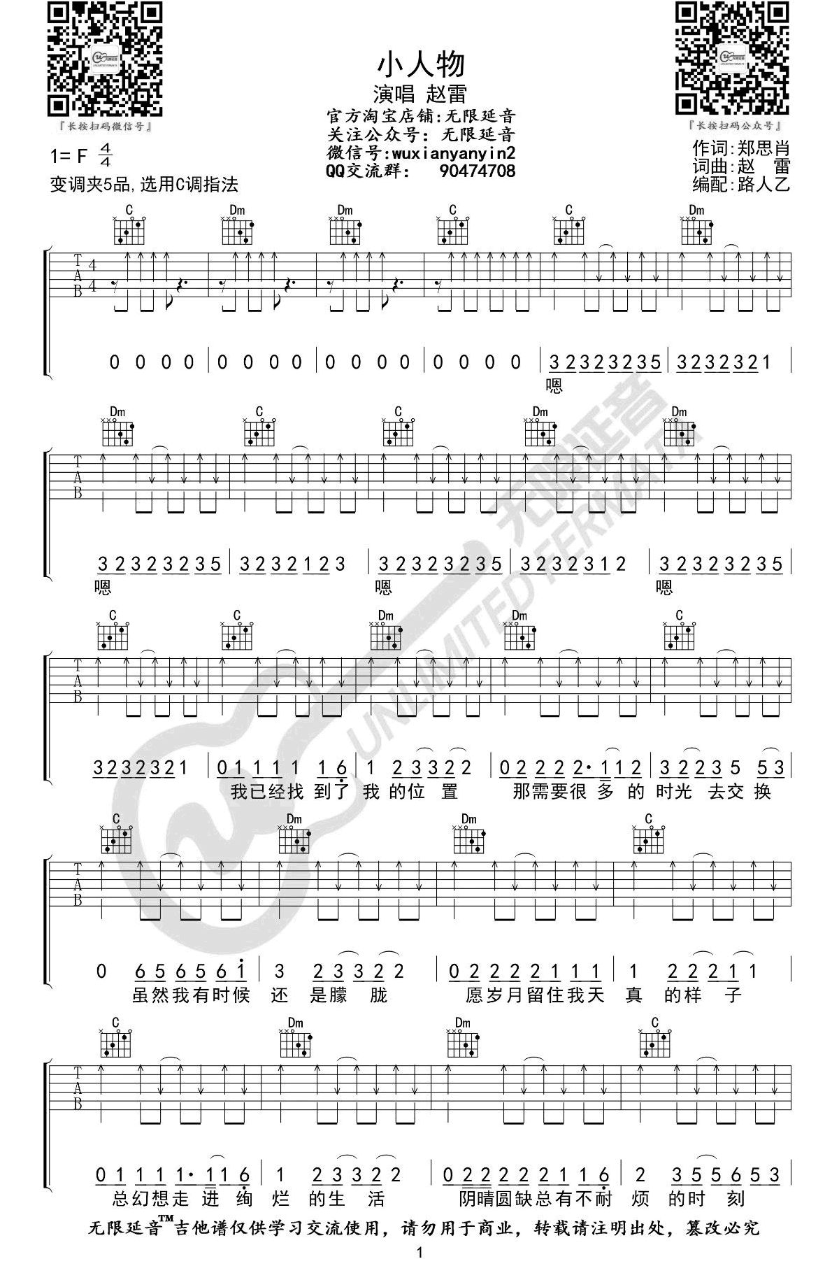 小人物吉他谱,它是赵雷演唱的歌曲,由无限延音制谱,是一首经典歌曲编配的C调吉他谱,演唱时可五品。小,原调F本谱采用C调赵雷演非常好听的弹唱曲谱,下面四张完整版高清曲谱由吉他谱大全为大家更新分享,有喜欢吉它的朋友欢迎关注!