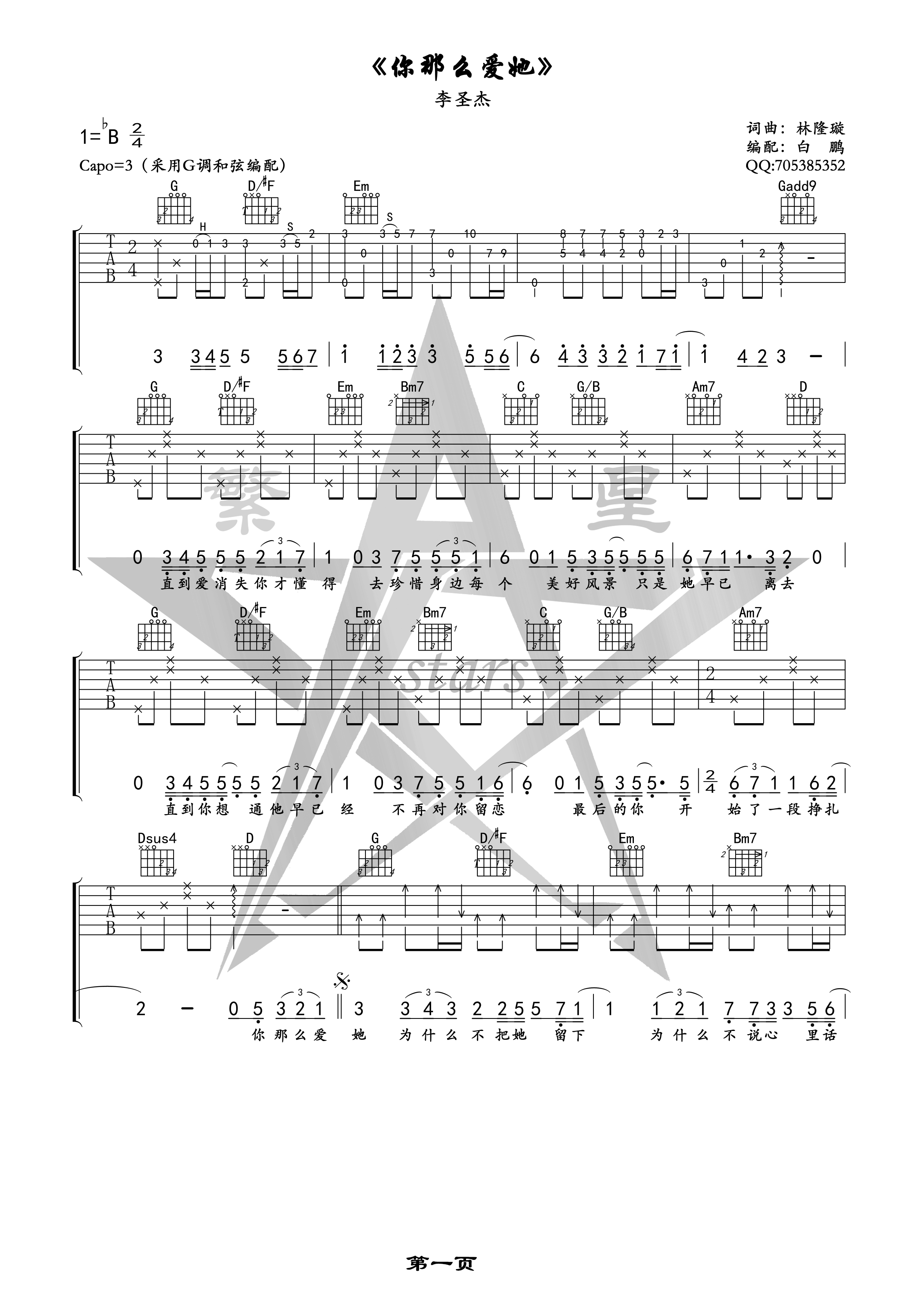 你那么爱她吉他谱,它是李圣杰演唱的歌曲,由繁星编配制谱,是一首经典歌曲编配的G调指弹编配的曲谱,