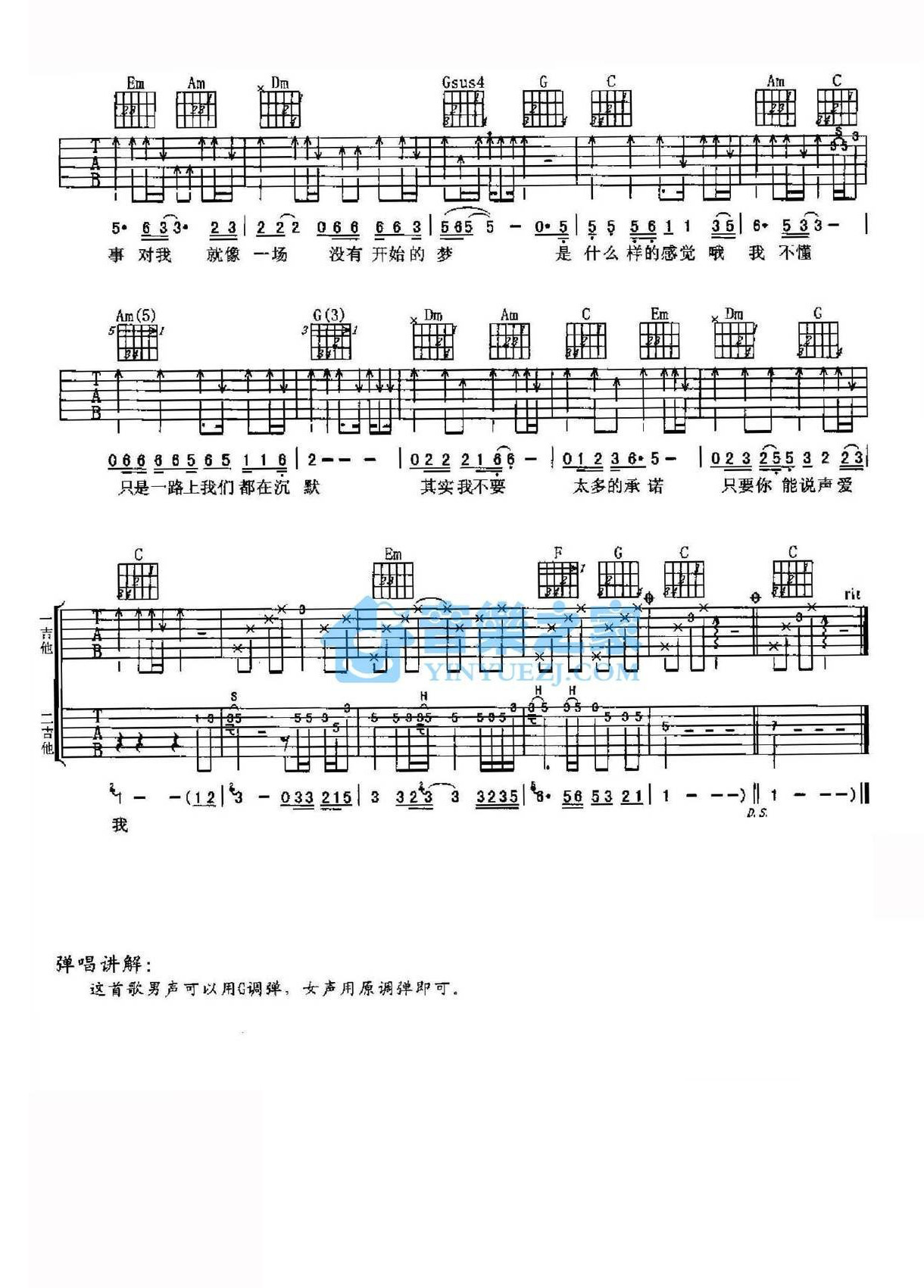 无声的你吉他谱,原版歌曲,简单C调弹唱教学,六线谱指弹简谱1张图