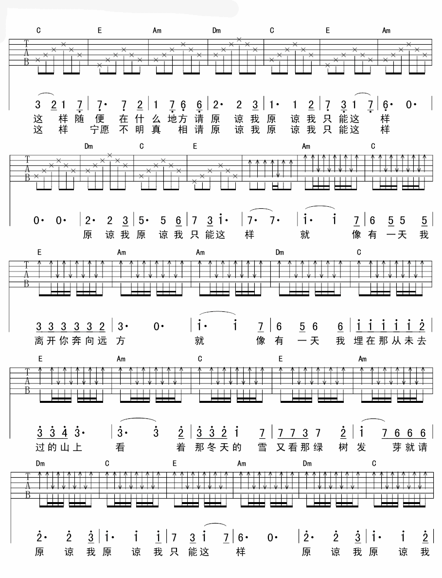 请原谅我吉他谱本曲谱是选用了C调指法,由延麟编配完成。这首歌曲应该会唱出大部分人的经历吧,在我们的一生之中,我们也许会听从身边人的安排,但也有一些人会十分固执的坚持自己的决定,他们敢于为自己所做的行为承担后果,永远坚信自己的决定,也许在有些人看来,会觉得任性会伤害一些人的心,但也请你能够原谅他,不是所有人都想按照别人既定的路线去走,他们的人生应该有自己做主。