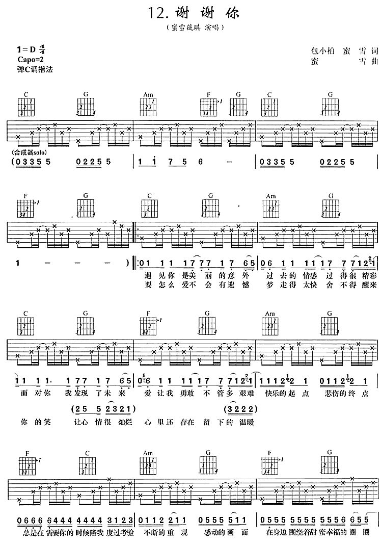 谢谢你,它是蜜雪薇琪演唱的歌曲,由网络转载编配制谱,是一首经典歌曲编配的 D调指弹编配的曲谱,