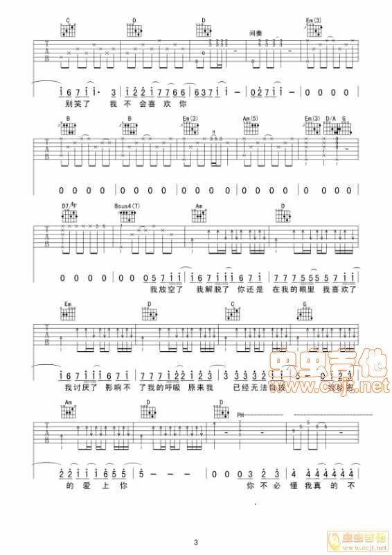 我不会喜欢你吉他谱,取自演唱的歌曲是经典E调指弹编配的曲谱,非常好听的弹唱曲谱,下面4张高清曲谱由吉曲谱网为大家更新分享,有喜欢吉它的朋友欢迎关注!