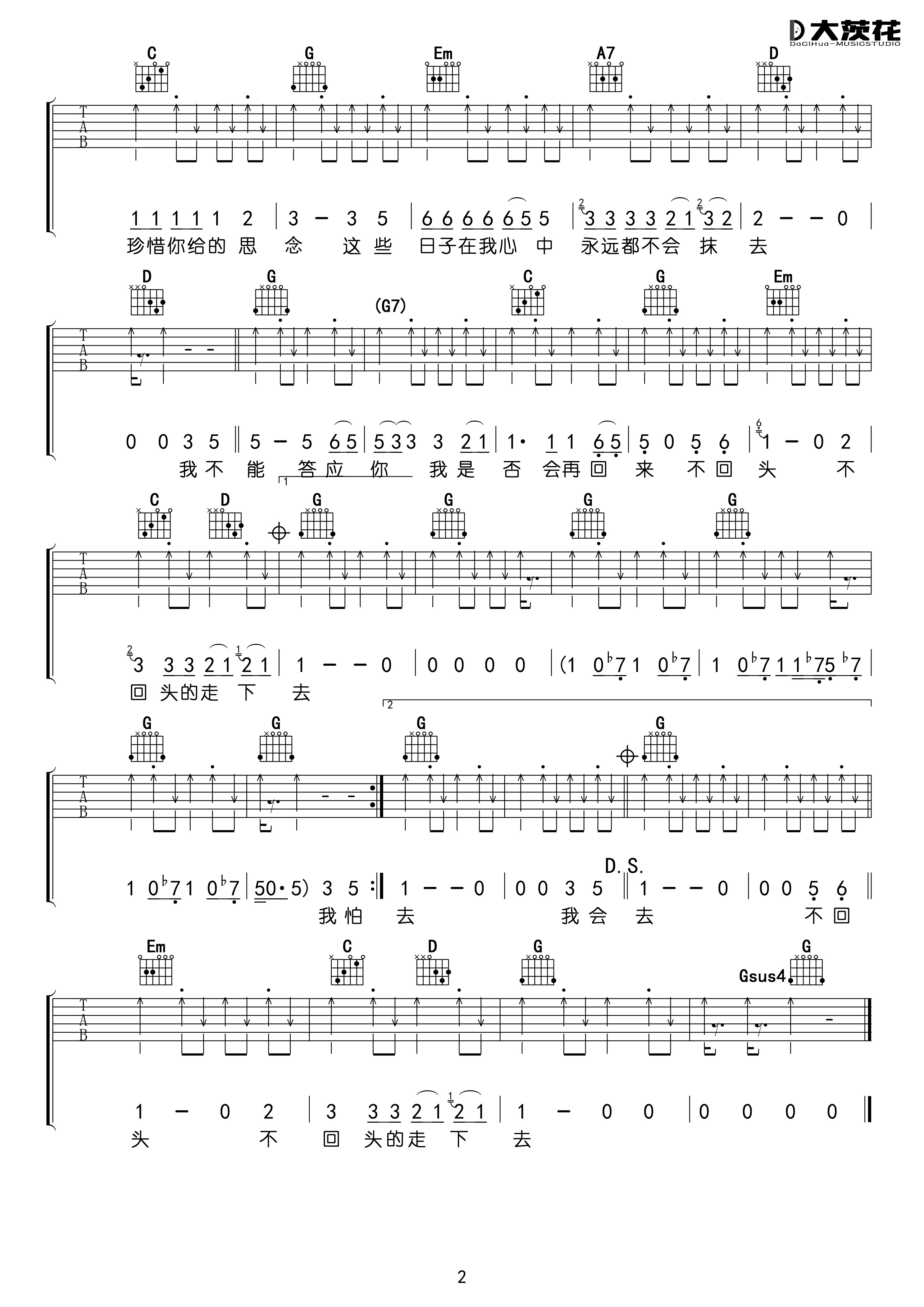 再见吉他谱,原版歌曲,简单C调弹唱教学,六线谱指弹简谱4张图