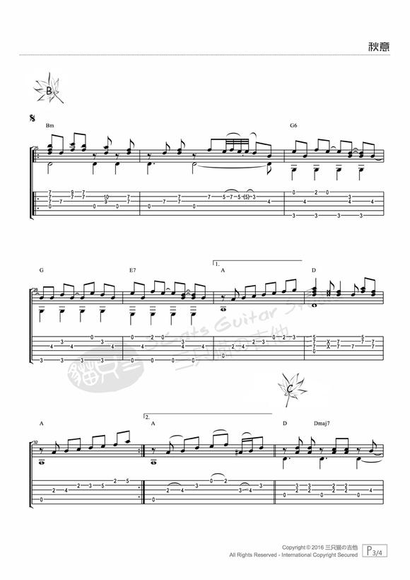 秋意指弹谱 原调六线谱_三只猫的吉他编配_三只猫秋意,它是三只猫演唱的歌曲,由三只猫的吉他编配制谱,是一首经典歌曲编配的 吉他指弹编配的曲谱,