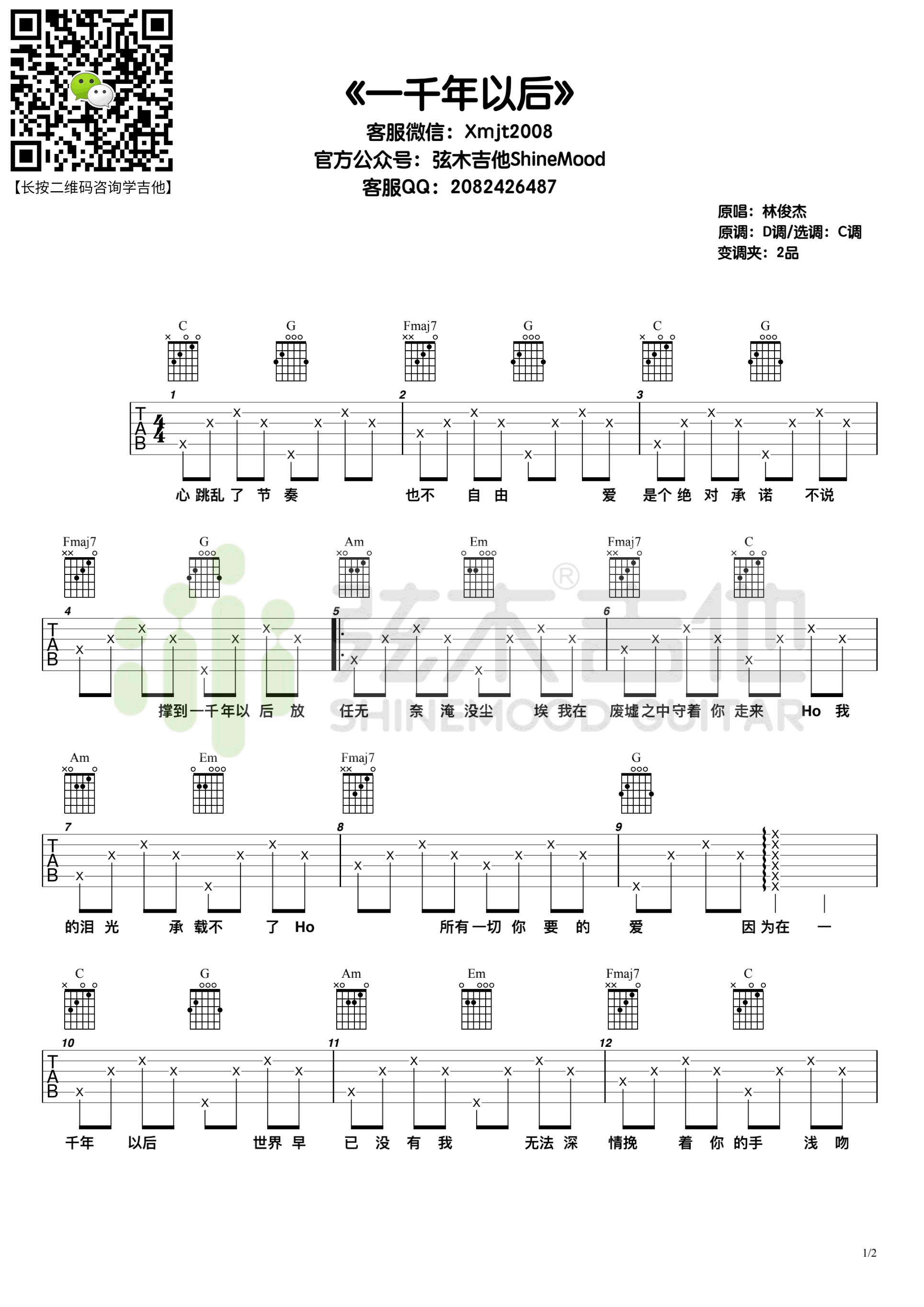 《一千年以后》这首歌,林俊杰演唱的一首经典代表歌曲,一千年以后六线谱,原调D选调C,变调夹夹第二品,两张弹唱图片谱,弦木吉他编配分享,上传更新。