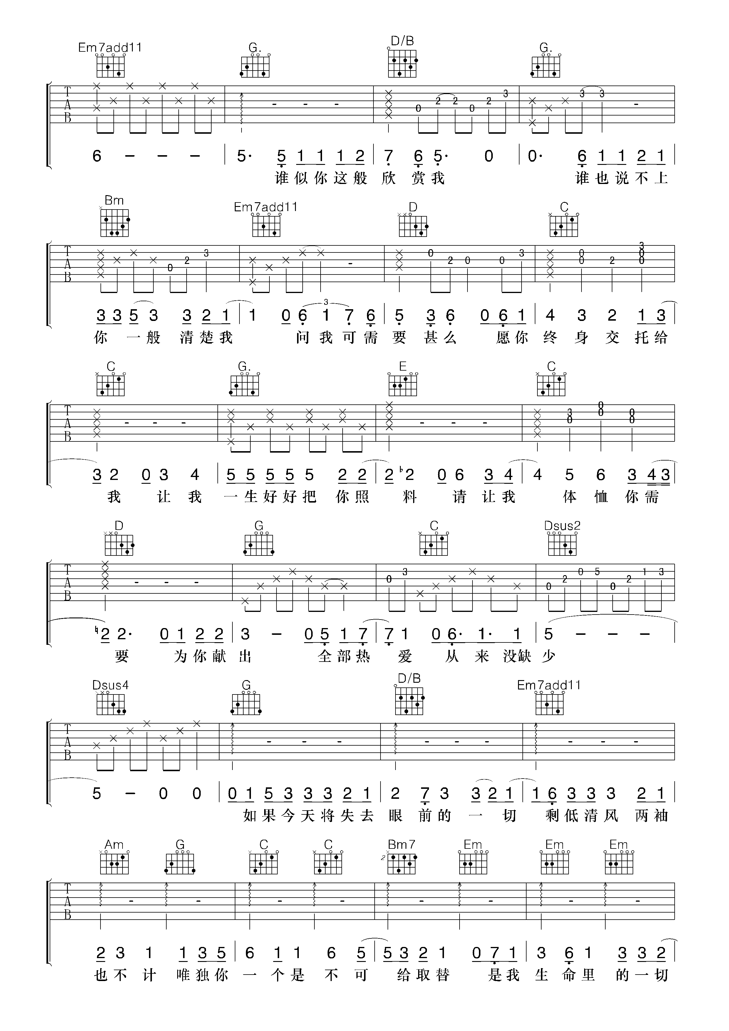 唯独你是不可取替吉他谱本曲谱是选用了B调指法,由小叶歌吉他编配完成。在感情里面没有对与错,只有爱与不爱,在感情里面,有一些人把爱情当作了人生的全部,失去了以后,整个世界都崩塌了,唯独他一直在心里无可取代,时间久了,食物会变质,衣服会褪色,花会枯萎凋谢,我们说时间是治愈的良药,时间不过是把你曾经在乎到要死的事变质成无所谓的繁琐小事 ,在他们的心里,那个他还是不可取替地存在。