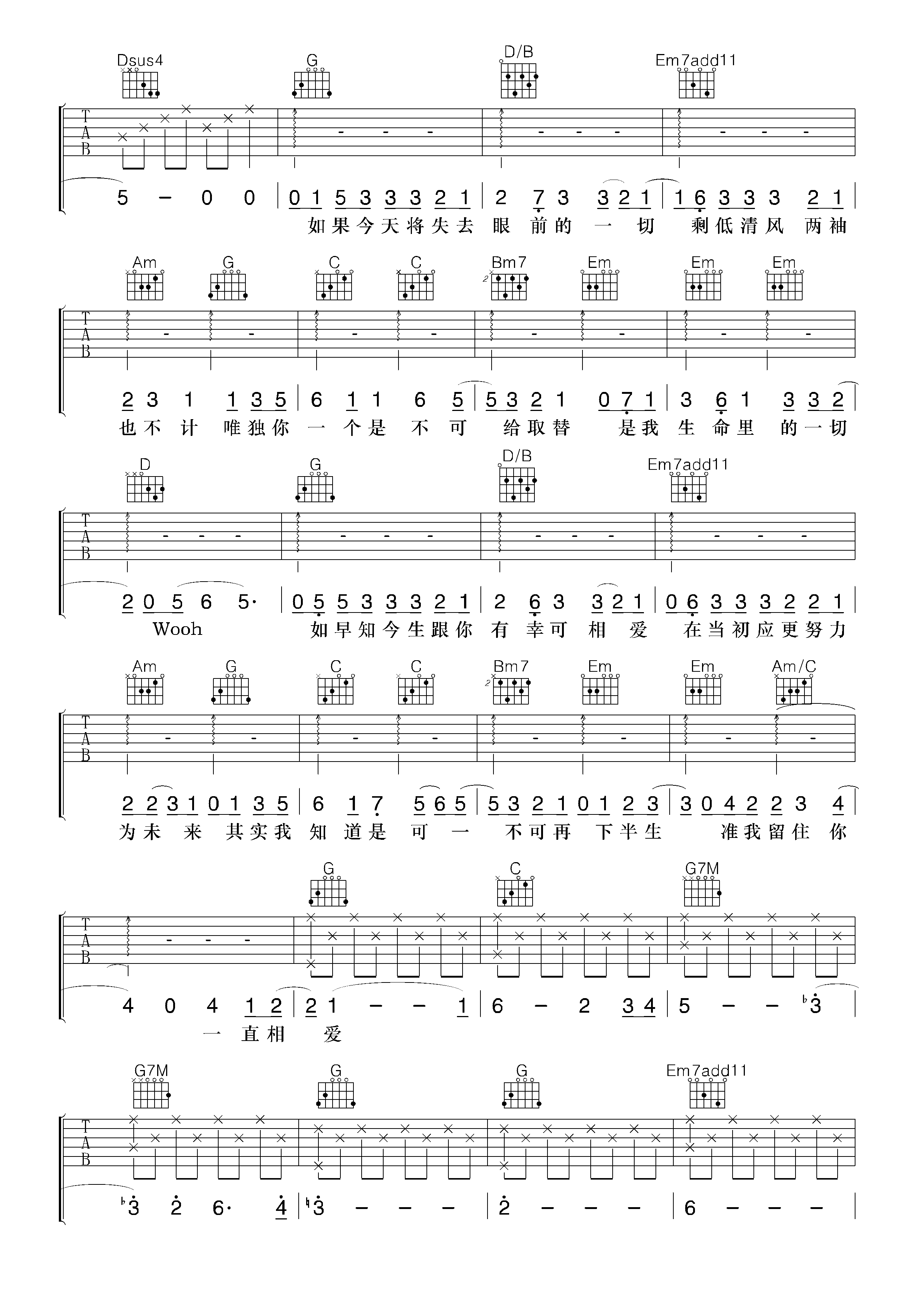 因为你所以我吉他谱,原版歌曲,简单B调弹唱教学,六线谱指弹简谱3张图