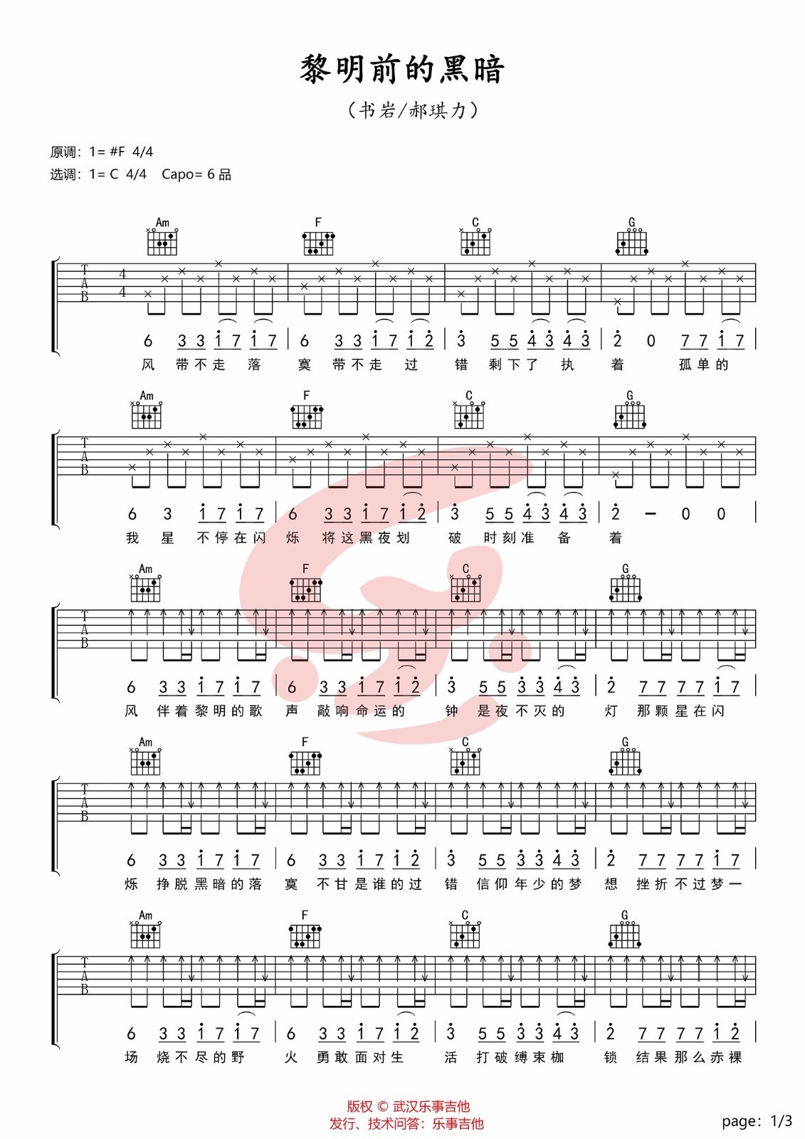 黎明前的黑暗吉他谱,原版书岩歌曲,简单C调弹唱教学,武汉乐事吉他版六线指弹简谱图