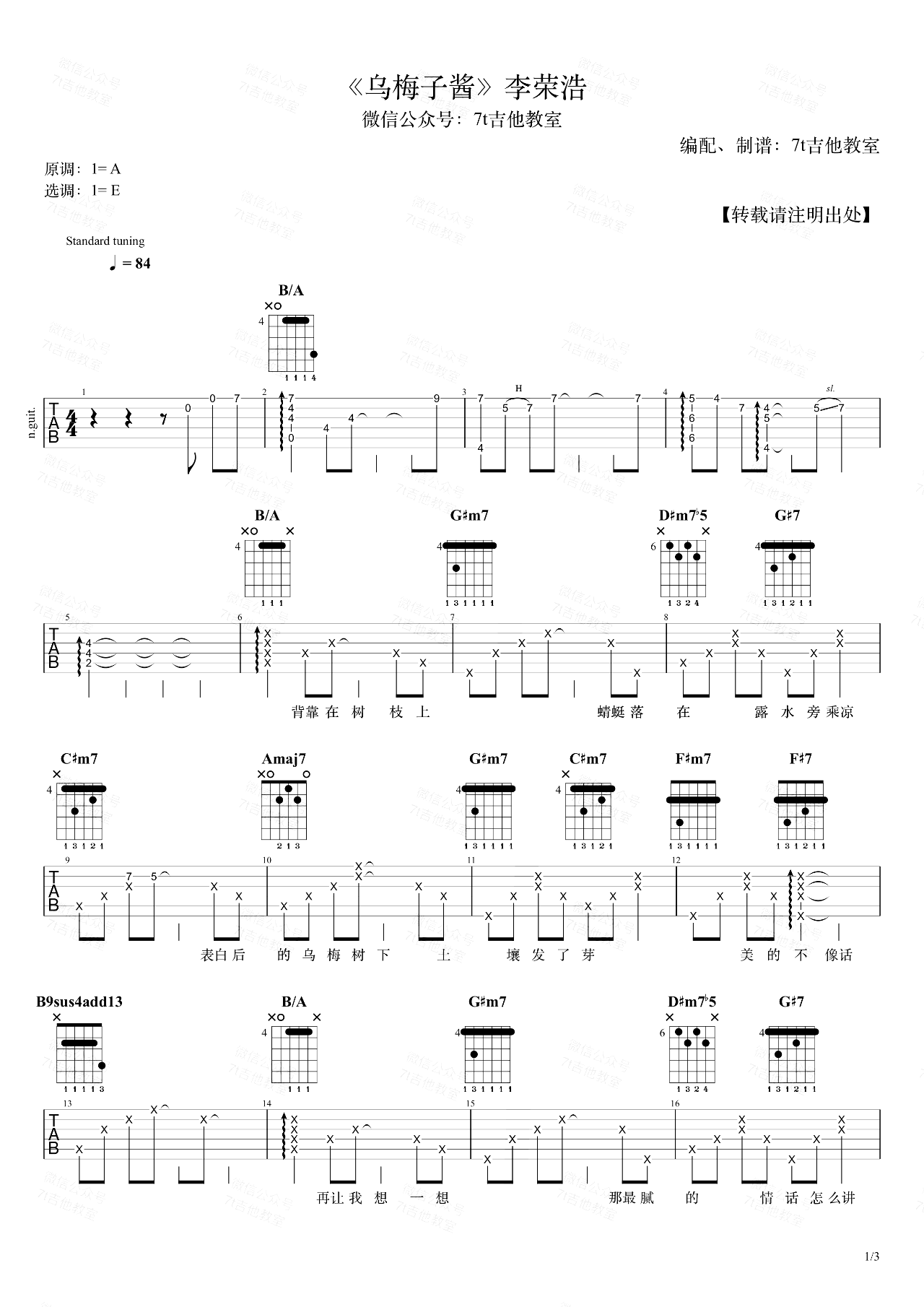 李荣浩《乌梅子酱》吉,它是李荣浩演唱的歌曲,由7T吉他教室制谱,是一首经典歌曲编配的吉他谱,演唱时可。想弹原,本谱采用李荣浩非常好听的弹唱曲谱,下面完整版高清曲谱由吉他谱大全为大家更新分享,有喜欢吉它的朋友欢迎关注!
