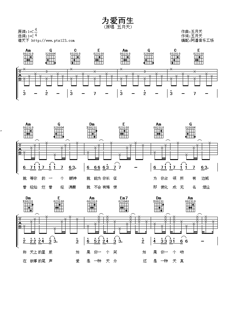 为爱而生吉他谱,它是五月天演唱的歌曲,由阿潘音乐工场编配制谱,是一首经典歌曲编配的C调指弹编配的曲谱,