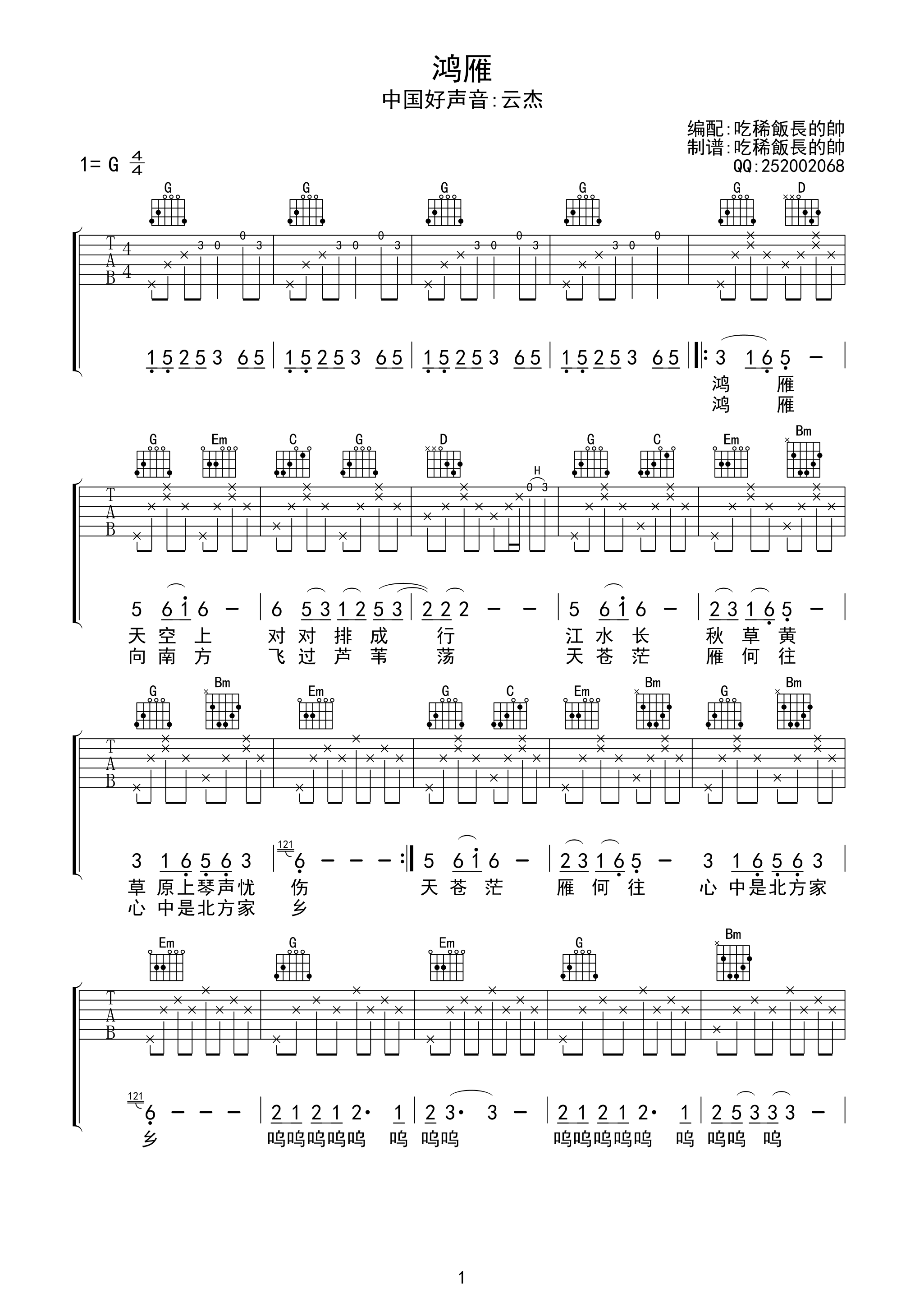 以上就是4/4节拍 G调版的鸿雁弹唱简谱,如果正是您所寻找的六线高清图片谱,希望能收藏本站,这里会完全免费且源源不断更新各种云杰简单入门曲谱