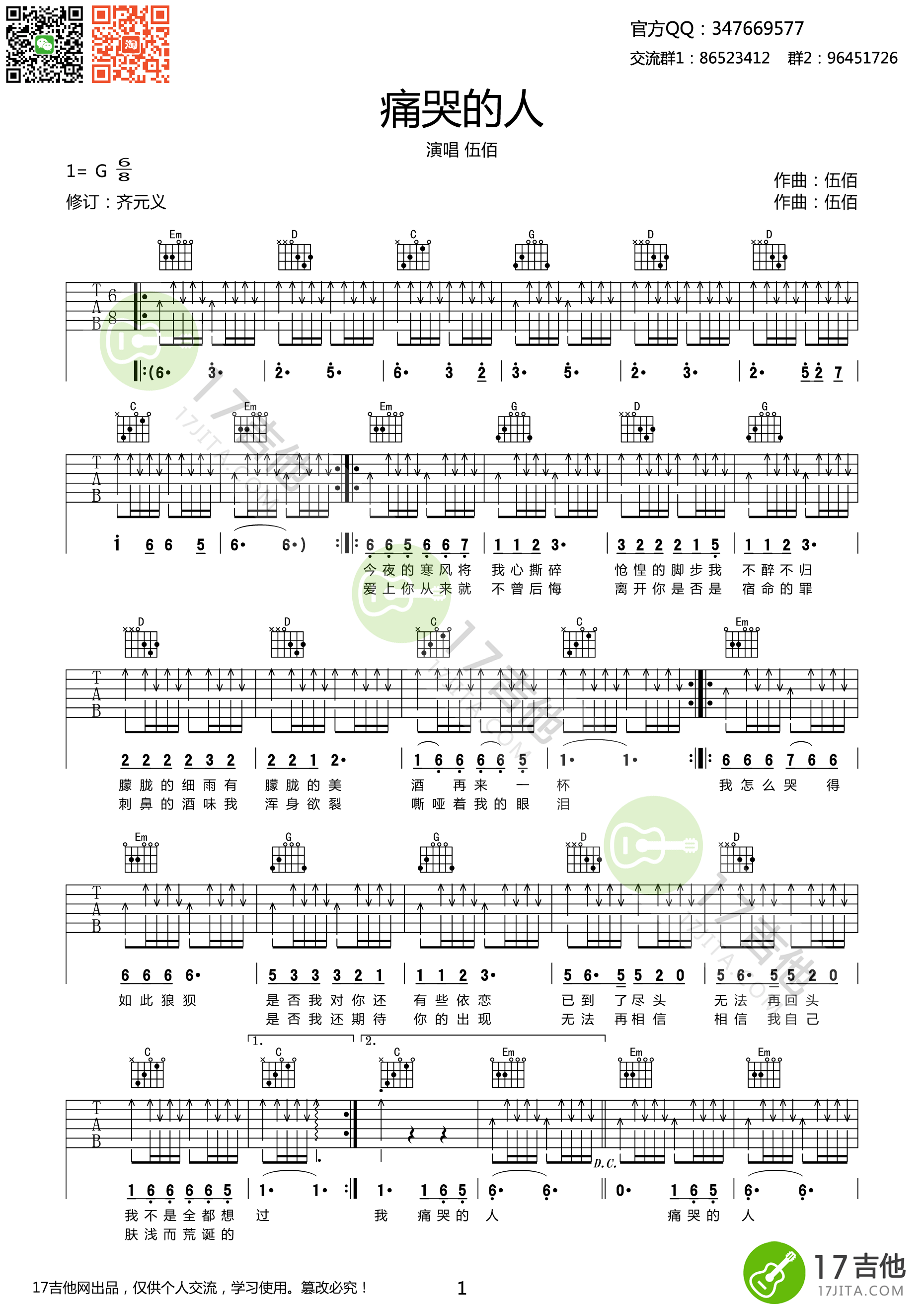 痛哭的人吉他谱本曲谱是选用了G调指法,由17吉他编配完成。《痛哭的人》这一首歌曲是伍佰创作。伍佰是一个很有音乐才华的人,他的音乐受到了很多人的认可,自出道后获奖无数,深受大众的喜爱,是华语区最知名的摇滚歌手,词曲创作人,音乐制作人之一,这首歌曲与生活紧密相关,每一处音符都在直击着我们的内心,伍佰的声音沧桑而又带着温暖,感觉很自由,不受任何的束缚,深深地唱进了我们每一个人的心里。