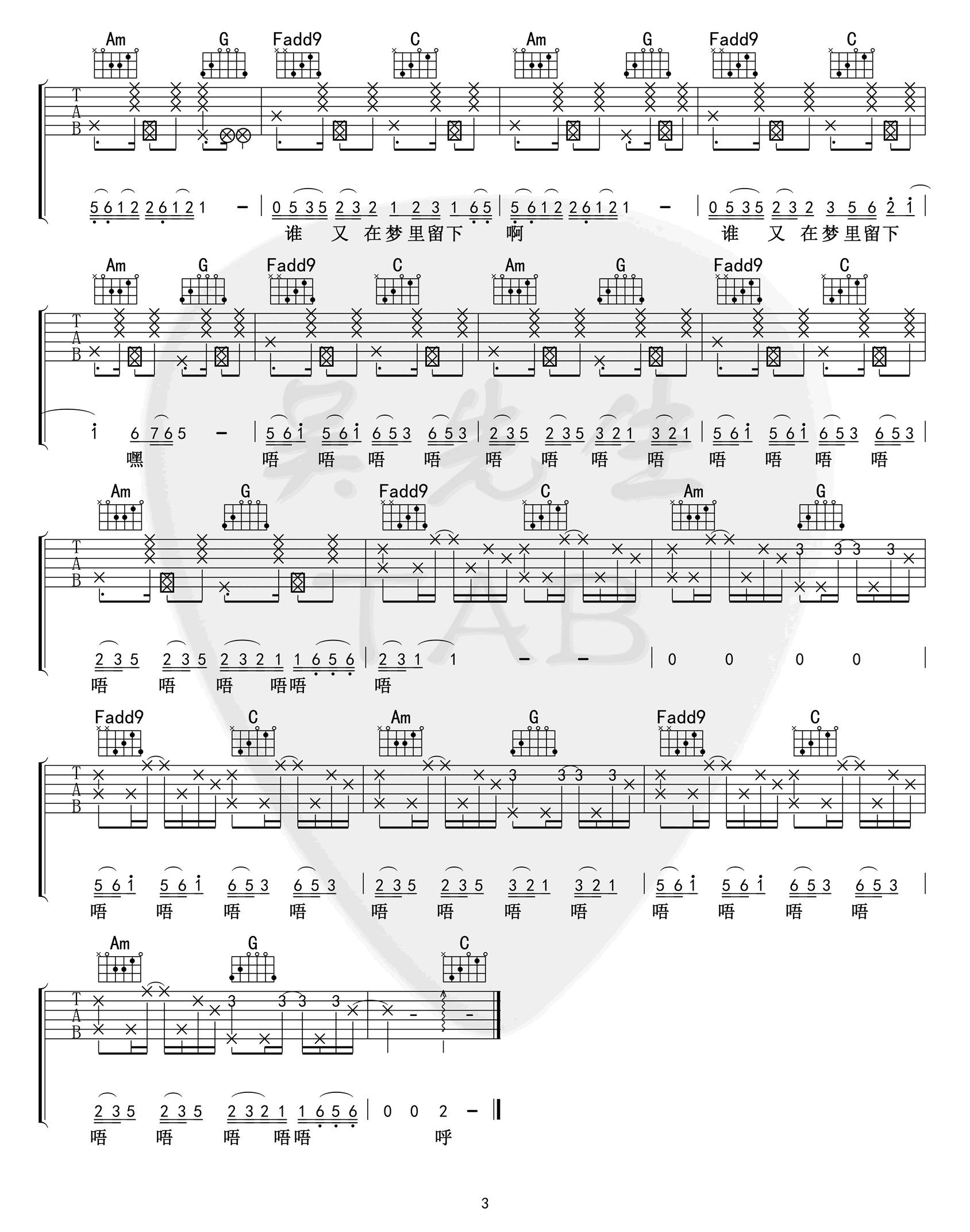 张钰琪《回答》吉他谱,张钰琪歌曲,简单指弹教学简谱,吴先生六线谱图片