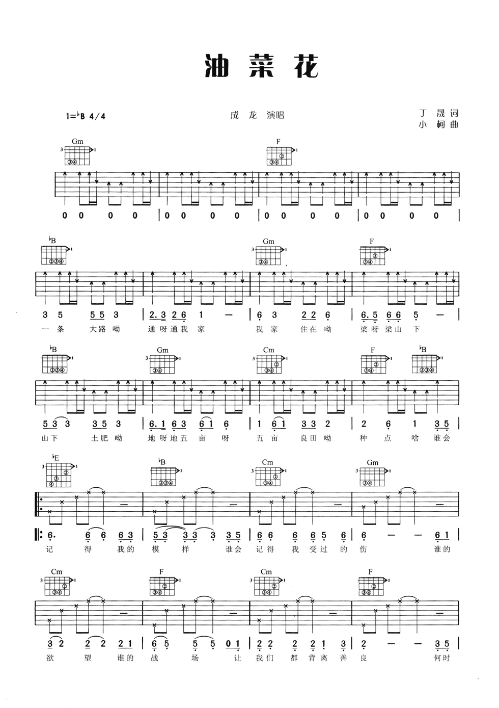 油菜花吉他谱,它是成龙演唱的歌曲,由网络转载编配制谱,是一首经典歌曲编配的B调指弹编配的曲谱,
