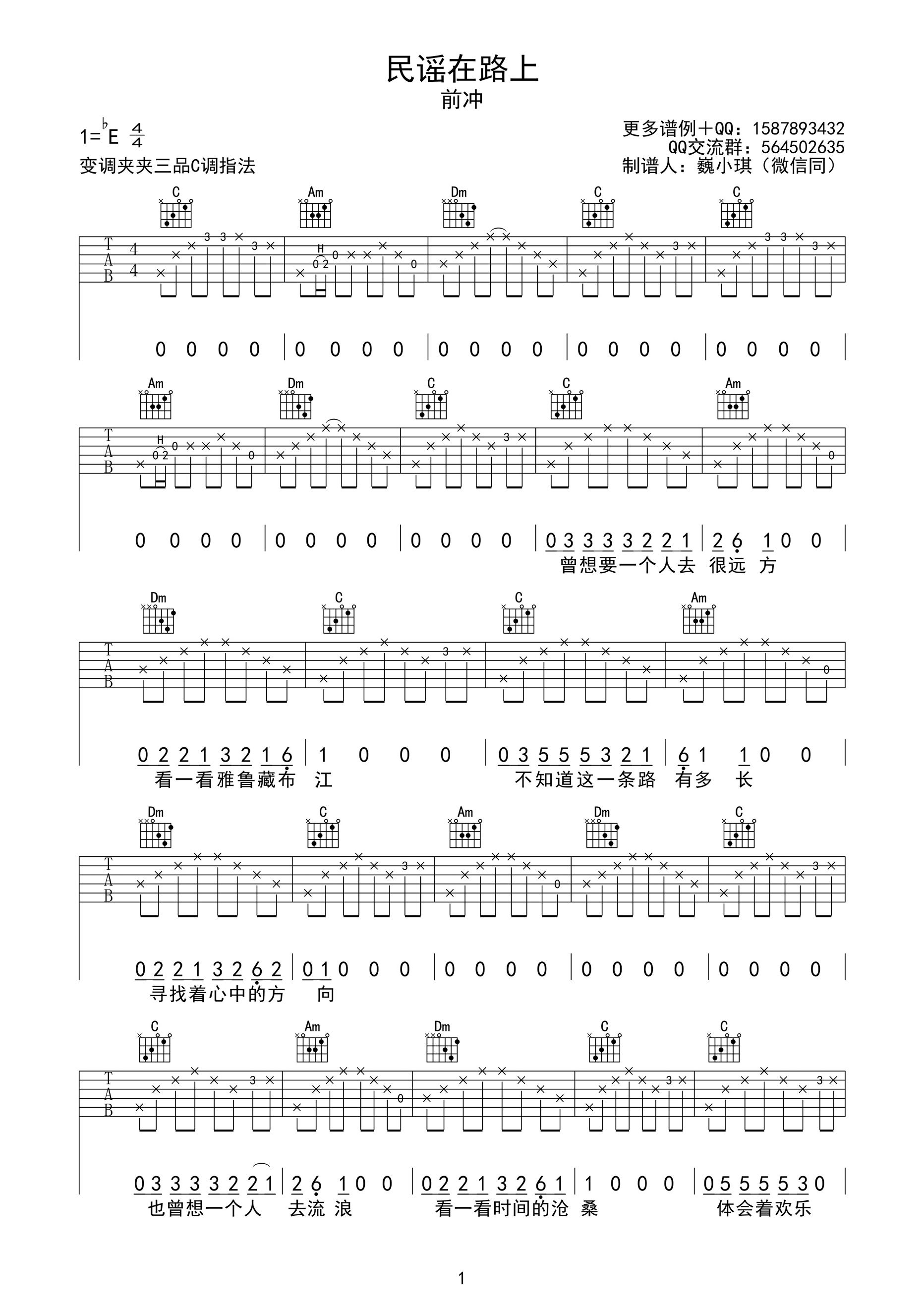 民谣在路上吉他谱,它是前冲演唱的歌曲,由巍小琪编配制谱,是一首经典歌曲编配的E调指弹编配的曲谱,