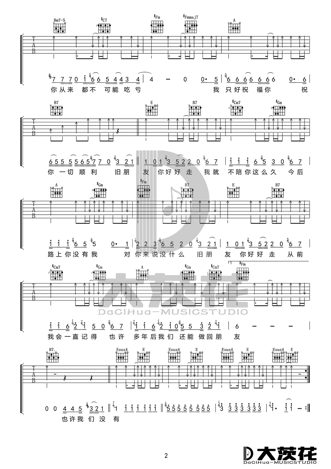 李荣浩《老友记》这首歌,E调指法编配,老友记六线谱,三张弹唱图片谱,大茨花音乐工作室编配出品,。