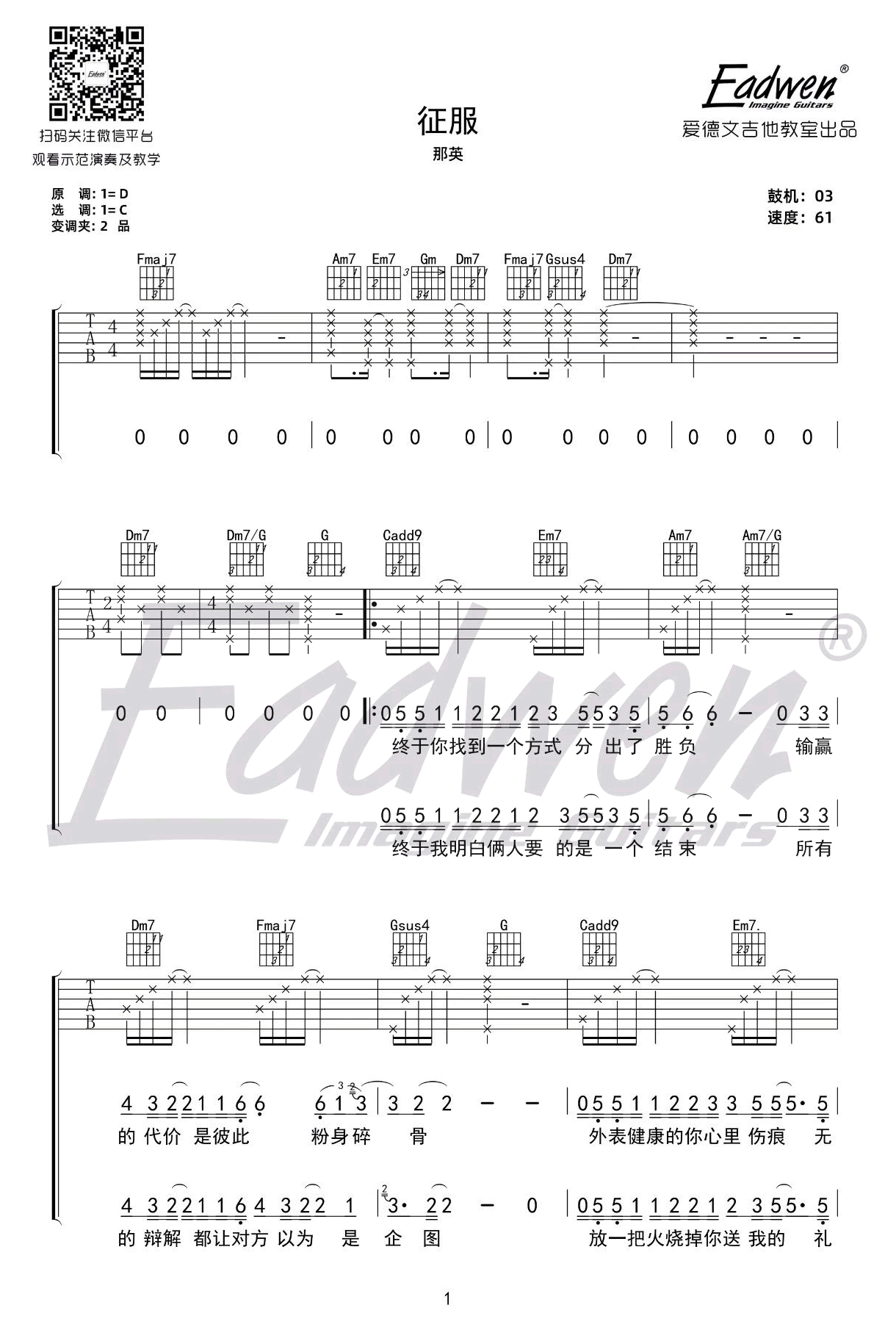 那英《征服》这首歌,原调D选调C,变调夹夹二品。征服吉他六线谱,完整版共四张弹唱谱,爱德文吉他教室编配分享,。随谱附上陈佰老师带来的《征服》吉他弹唱教学视频,琴友们参照示范讲解练习。