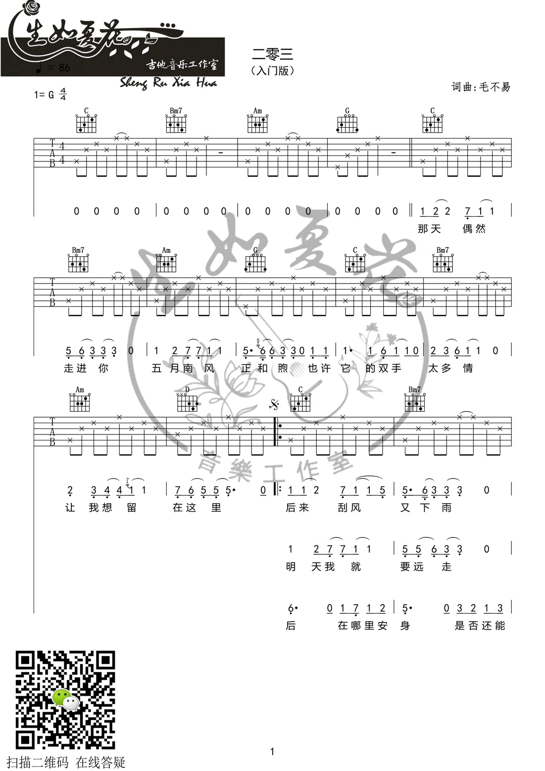 二零三吉他谱,毛不易歌曲,简单指弹教学简谱,生如夏花六线谱图片