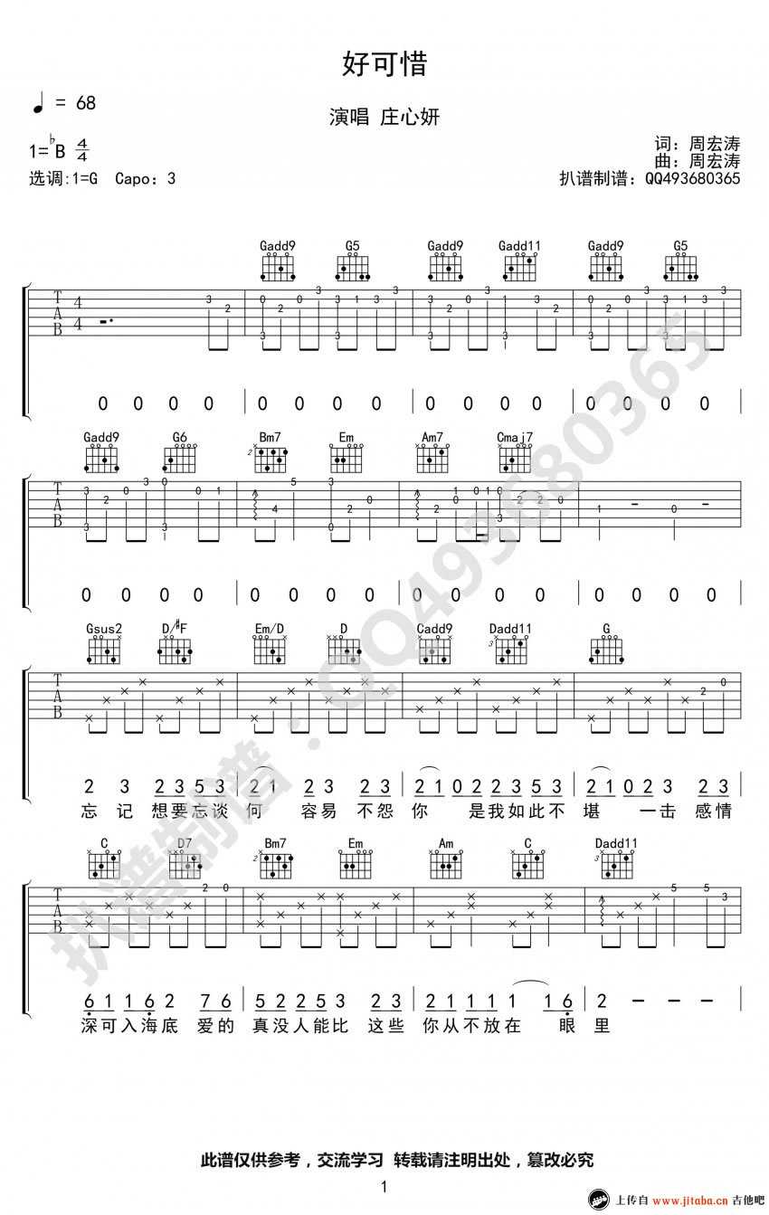 好可惜吉他谱,它是庄心妍演唱的歌曲,由吉他吧编配制谱,是一首经典歌曲编配的G调指弹编配的曲谱,