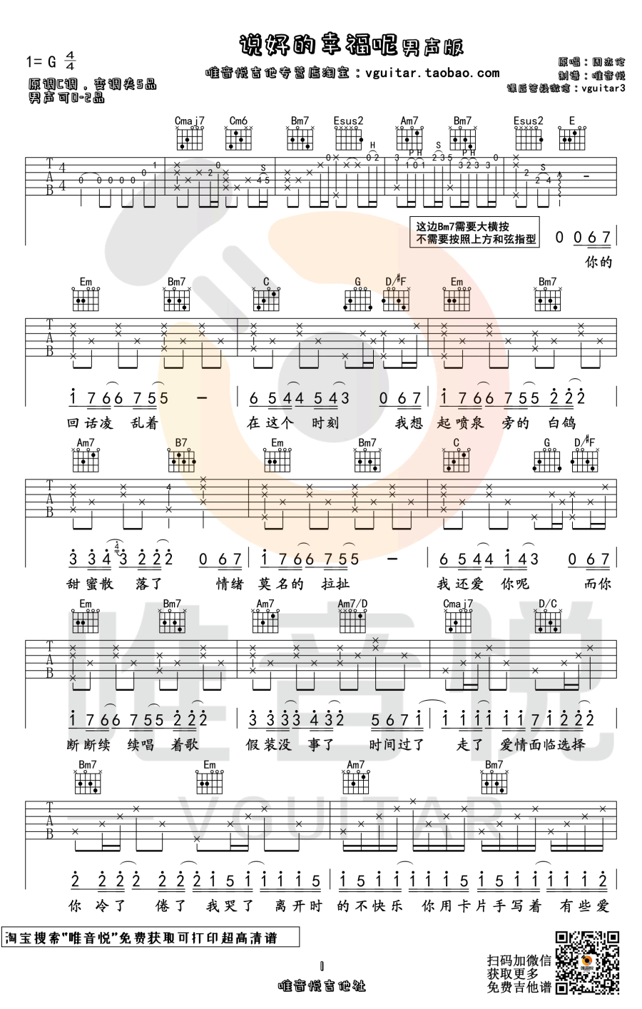 说好的幸福呢吉他谱_周杰伦_吉他弹唱教学视频_G调吉他谱 ,它是周杰伦演唱的歌曲,由唯音悦吉他制谱,是一首经典歌曲编配的吉他吉他谱,演唱时可弹唱时变调夹夹0-2品,,原调为原调。这本谱采用吉他,非常好听的弹唱曲谱......