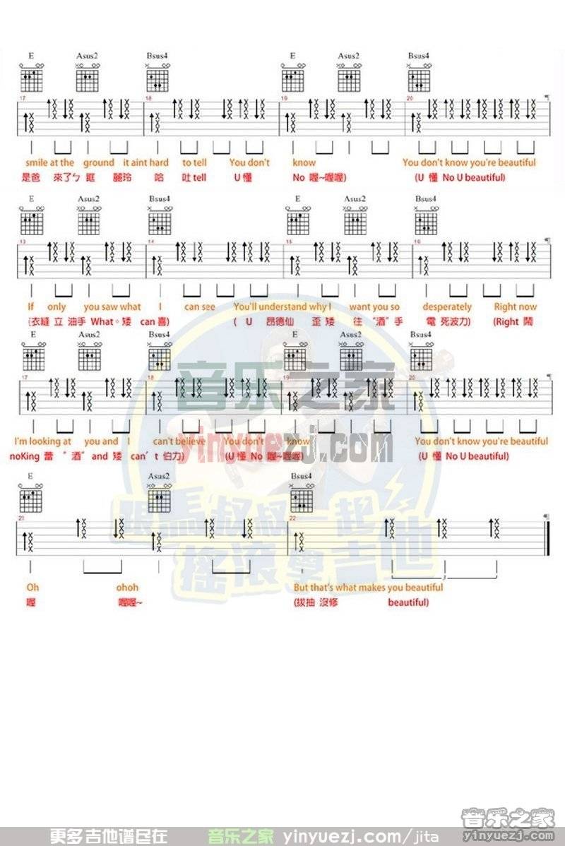 WhatMakesYouBeautiful吉他谱,原版OneDirection歌曲,简单E调弹唱教学,音乐之家版六线指弹简谱图