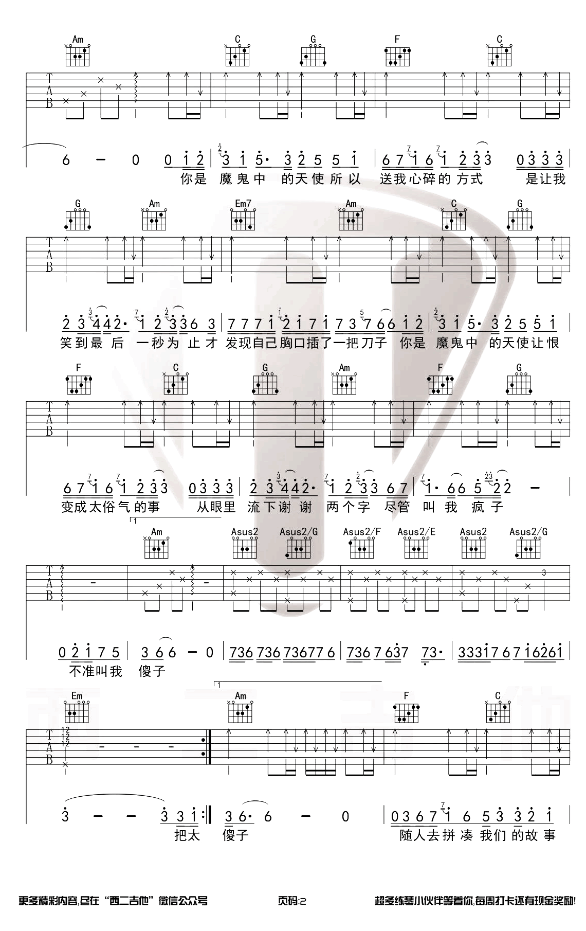 魔鬼中的天使吉他谱,它是姚若龙陈小演唱的歌曲,由西二吉他制谱,是一首经典歌曲编配的吉他谱,,原调C调本谱采用康树龙非常好听的弹唱曲谱,下面完整版高清曲谱由吉他谱大全为大家更新分享,有喜欢吉它的朋友欢迎关注!