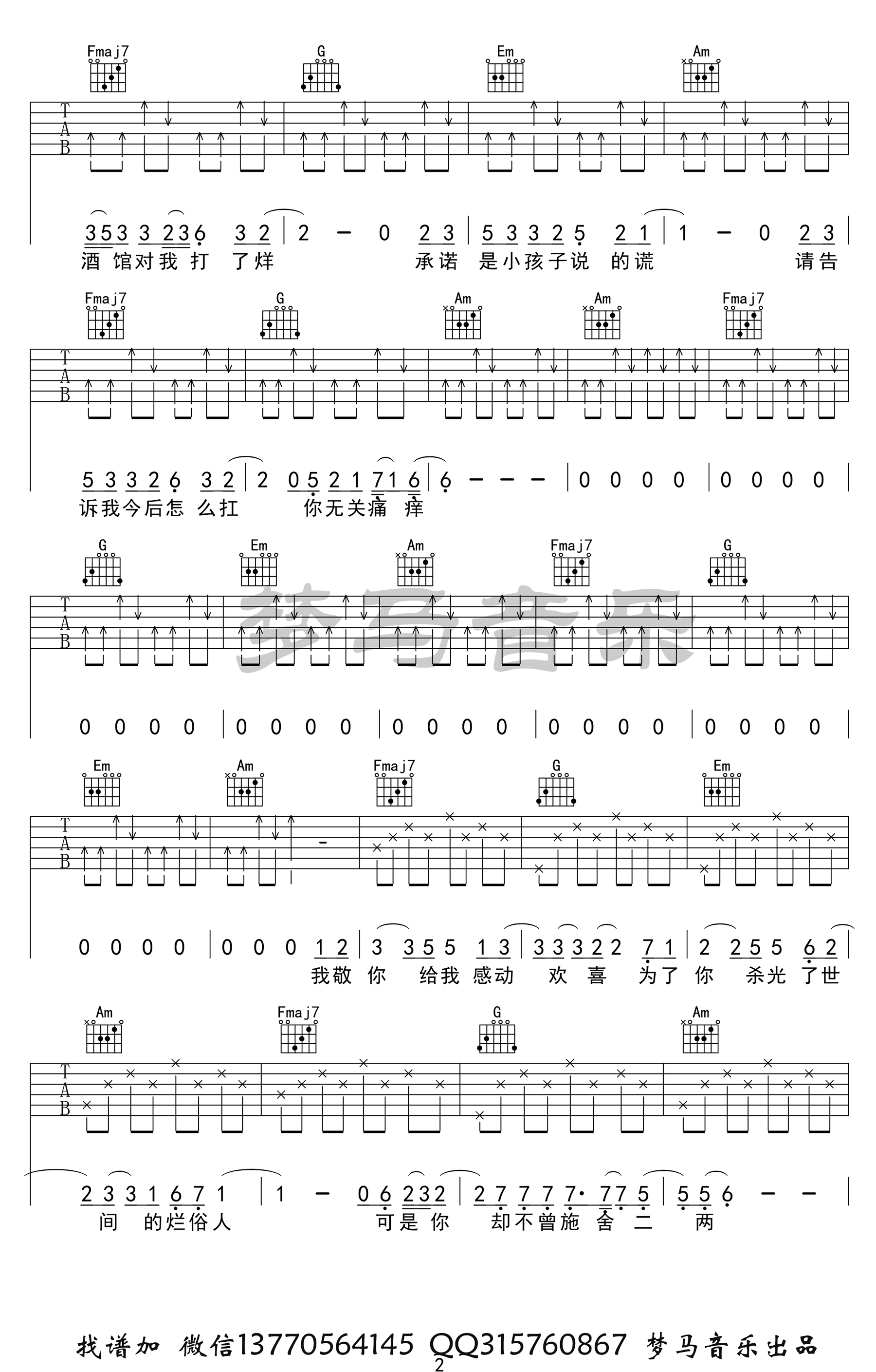 你的酒馆对我打了烊吉,陈雪凝歌曲,简单指弹教学简谱,梦马音乐六线谱图片