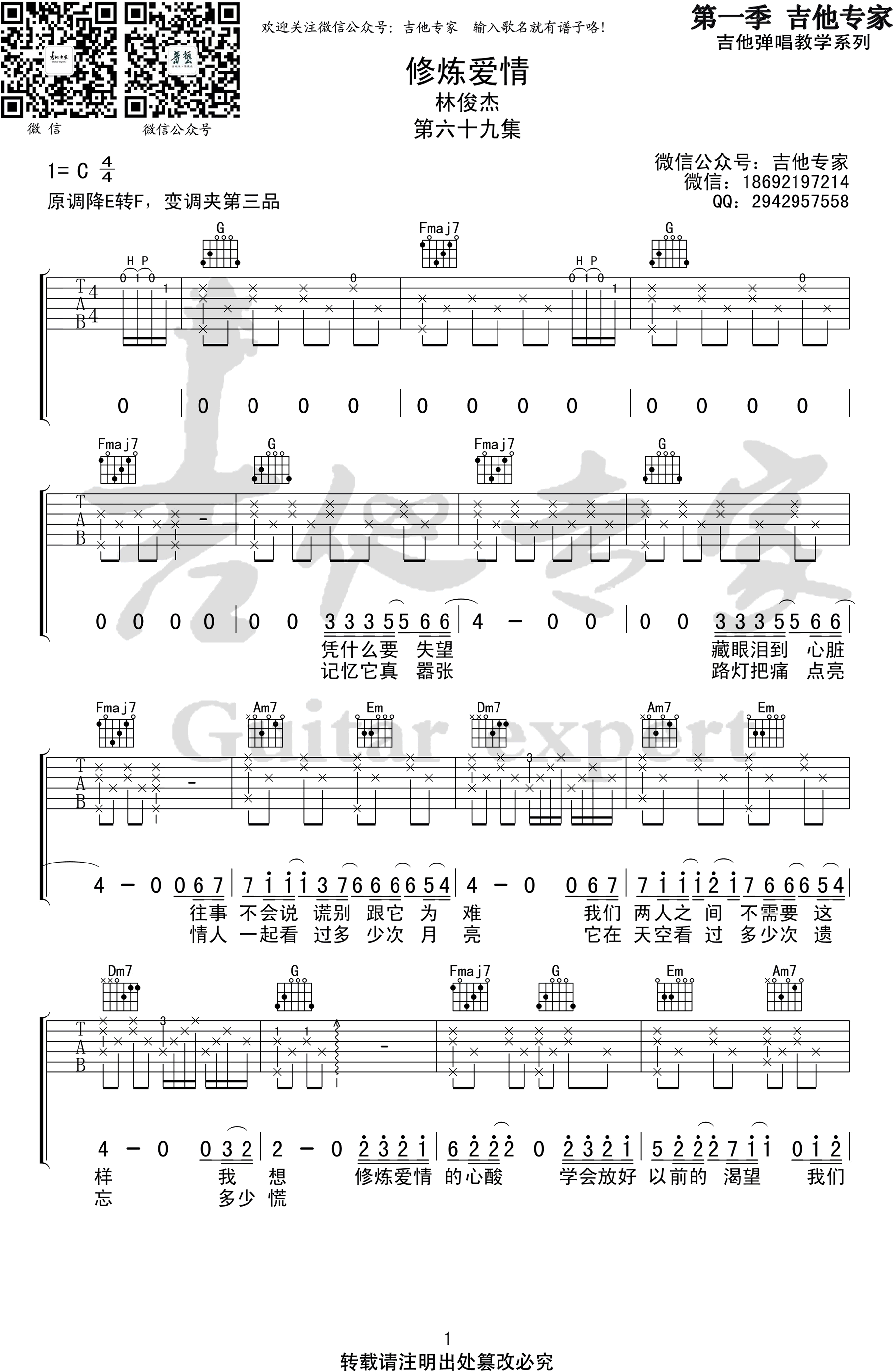 修炼爱情吉他谱,取自演唱的歌曲是经典C调指弹编配的曲谱,非常好听的弹唱曲谱,下面3张高清曲谱由吉曲谱网为大家更新分享,有喜欢吉它的朋友欢迎关注!