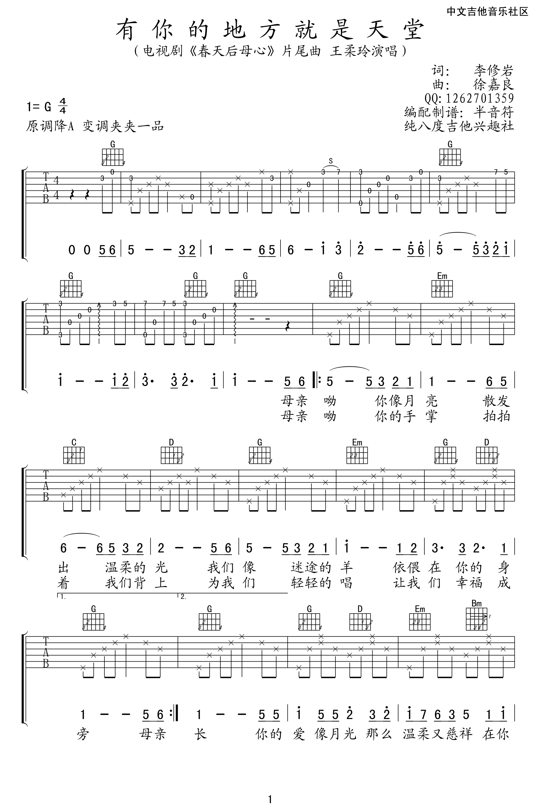 有你的地方就是天堂吉他谱本曲谱是选用了G调指法,由纯八度吉他编配完成。这首歌曲是献给母亲的,在我们成长旅途中,母亲为我们操劳一生,无怨无悔,小时候,我们总是会嫌弃母亲太啰嗦,想要逃离母亲的怀抱,但是,长大以后离开了家,才知道,原来在家的日子是如此幸福,就像这是歌名一样,有你的地方就是天堂,我们回家就可以吃到热腾腾的饭菜,可以有温暖舒适的被窝,母亲为我们付出的实在太多。