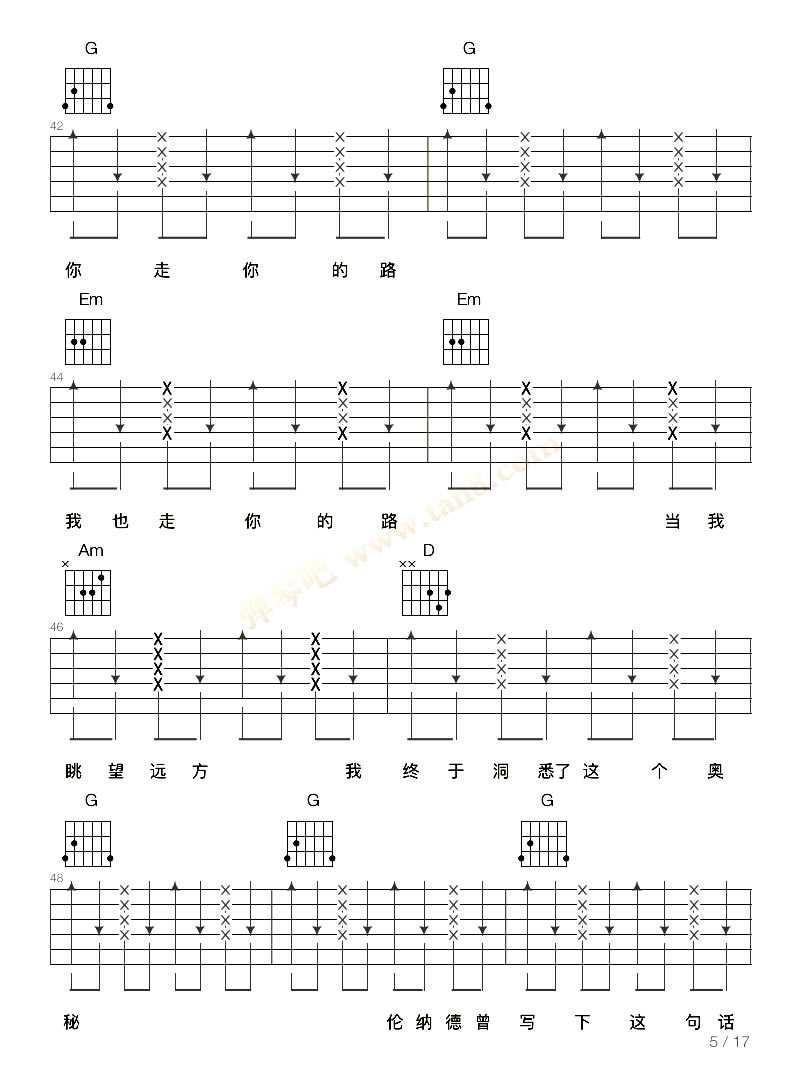 你走你的路吉他谱本曲谱是选用了C调指法,由吉他吧编配完成。在这首歌曲的旋律和歌词之中,会让人陷入了沉思。在我们的一生之中会遇到很多人,他们有的只是匆匆过客,有的会陪你走过人生的一段旅程,无论是相聚还是分别都是一段缘分,我们不需要感到难过,天下没有不散的筵席,有缘我们会再次相见的,我们永远不知道下一刻会发生什么,只要走好自己当下的路,一切的事情都是安排好了的。