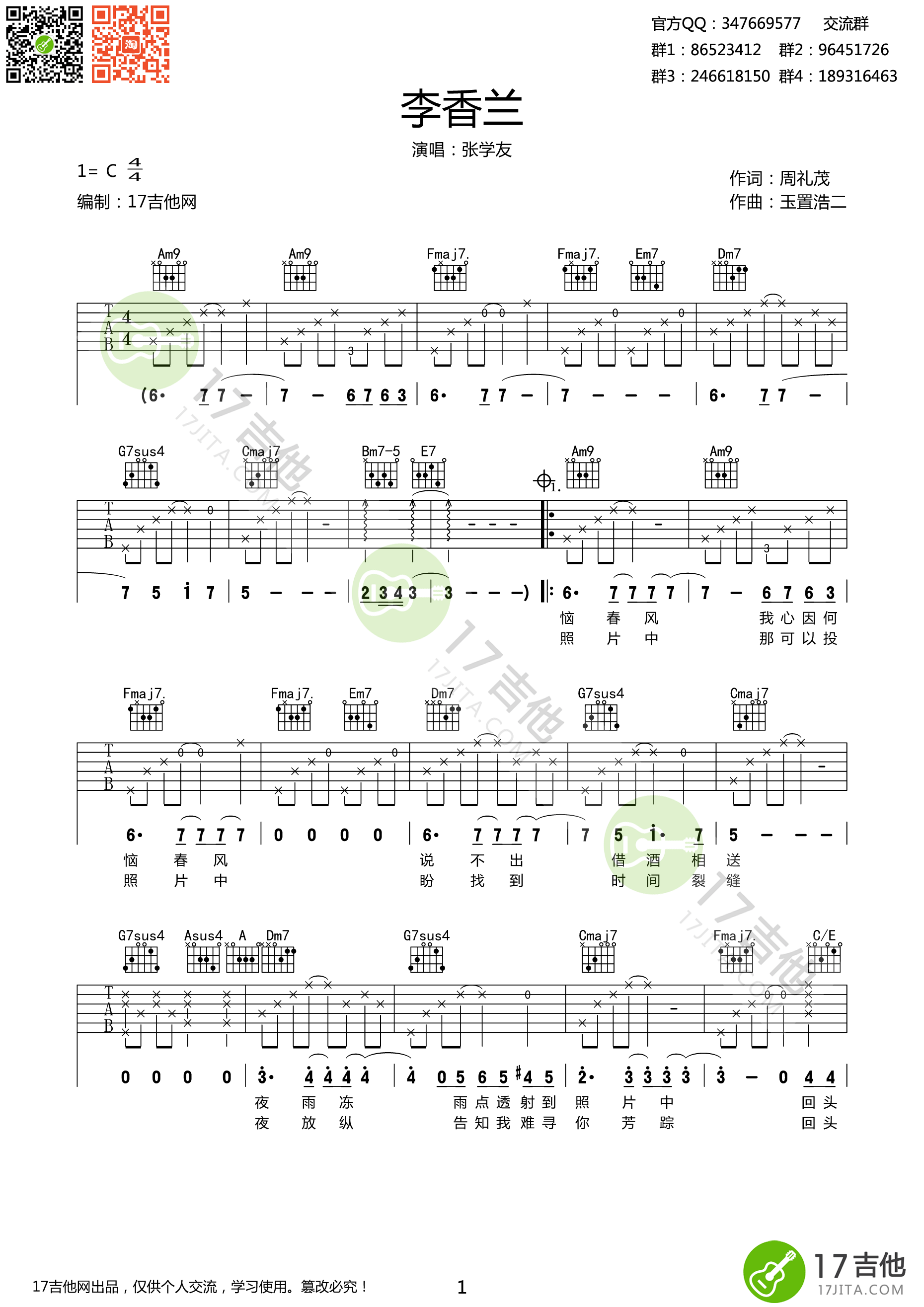 李香兰吉他谱,它是张学友演唱的歌曲,由17吉他编配制谱,是一首经典歌曲编配的C调指弹编配的曲谱,