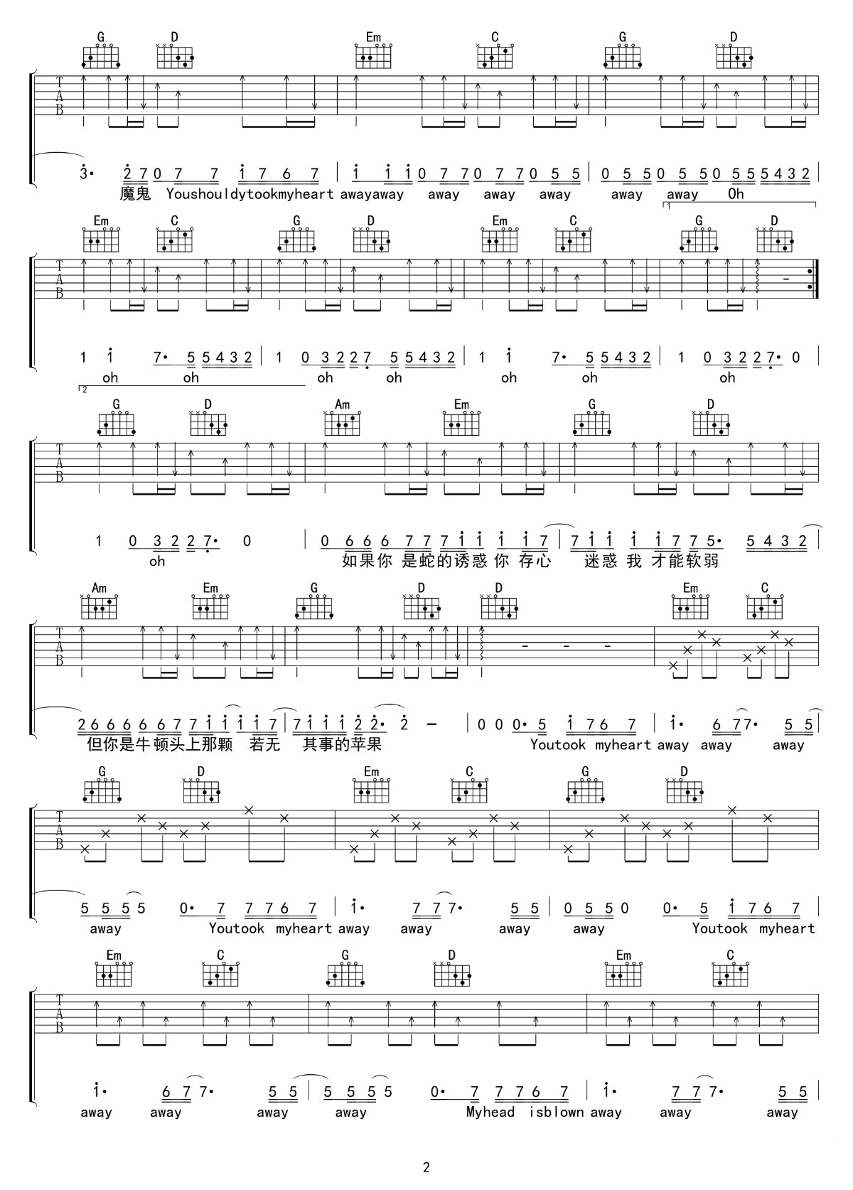 来自天堂的魔鬼吉他谱,原版邓紫棋歌曲,简单G调指弹曲谱,高清六线乐谱