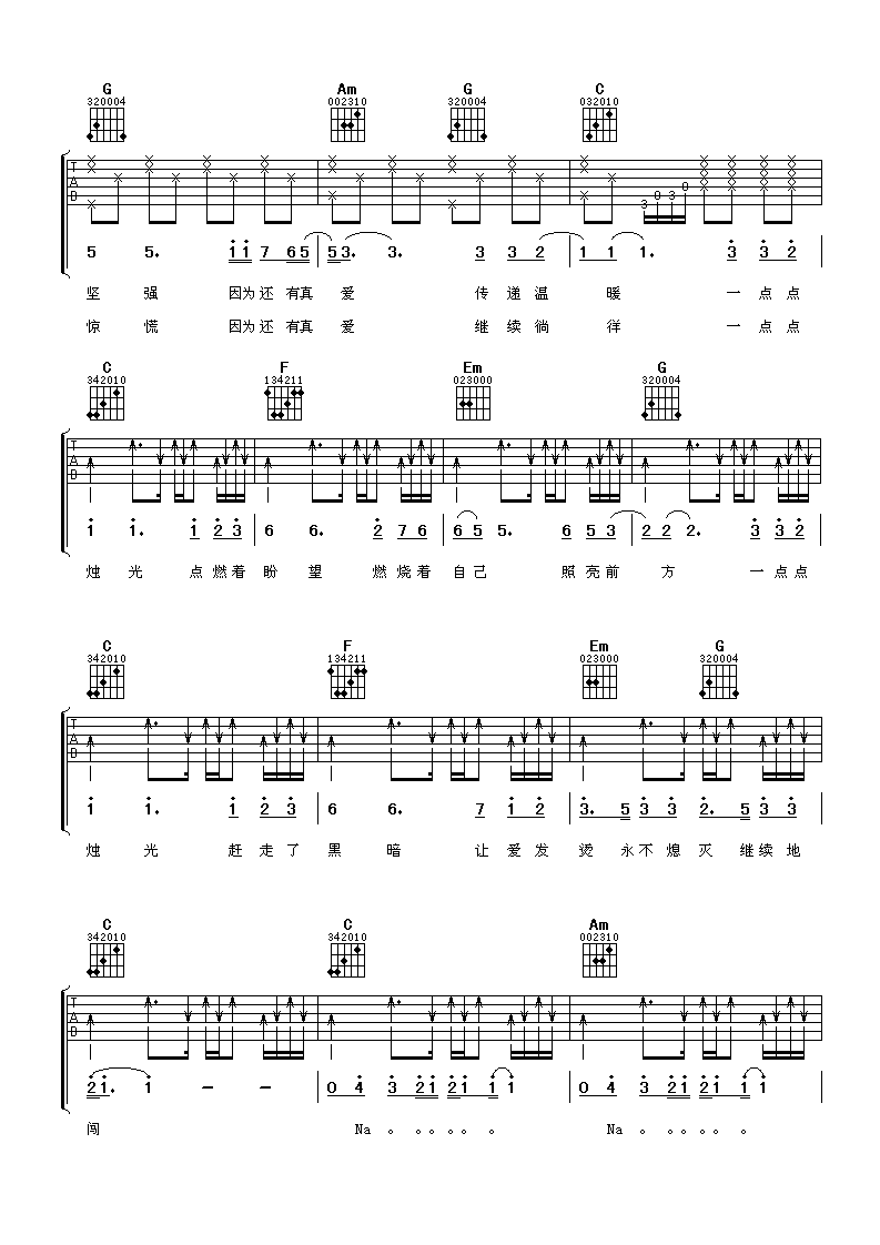 以上就是4/4节拍C调版的烛光弹唱简谱,如果正是您所寻找的六线高清图片谱,希望能收藏本站,这里会完全免费且源源不断更新各种谢霆锋简单入门曲谱