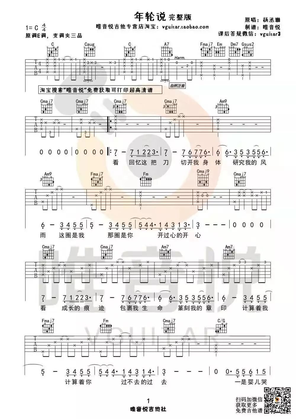 年轮说吉他谱,它是杨丞琳演唱的歌曲,由唯音悦编配制谱,是一首经典歌曲编配的C调指弹编配的曲谱,