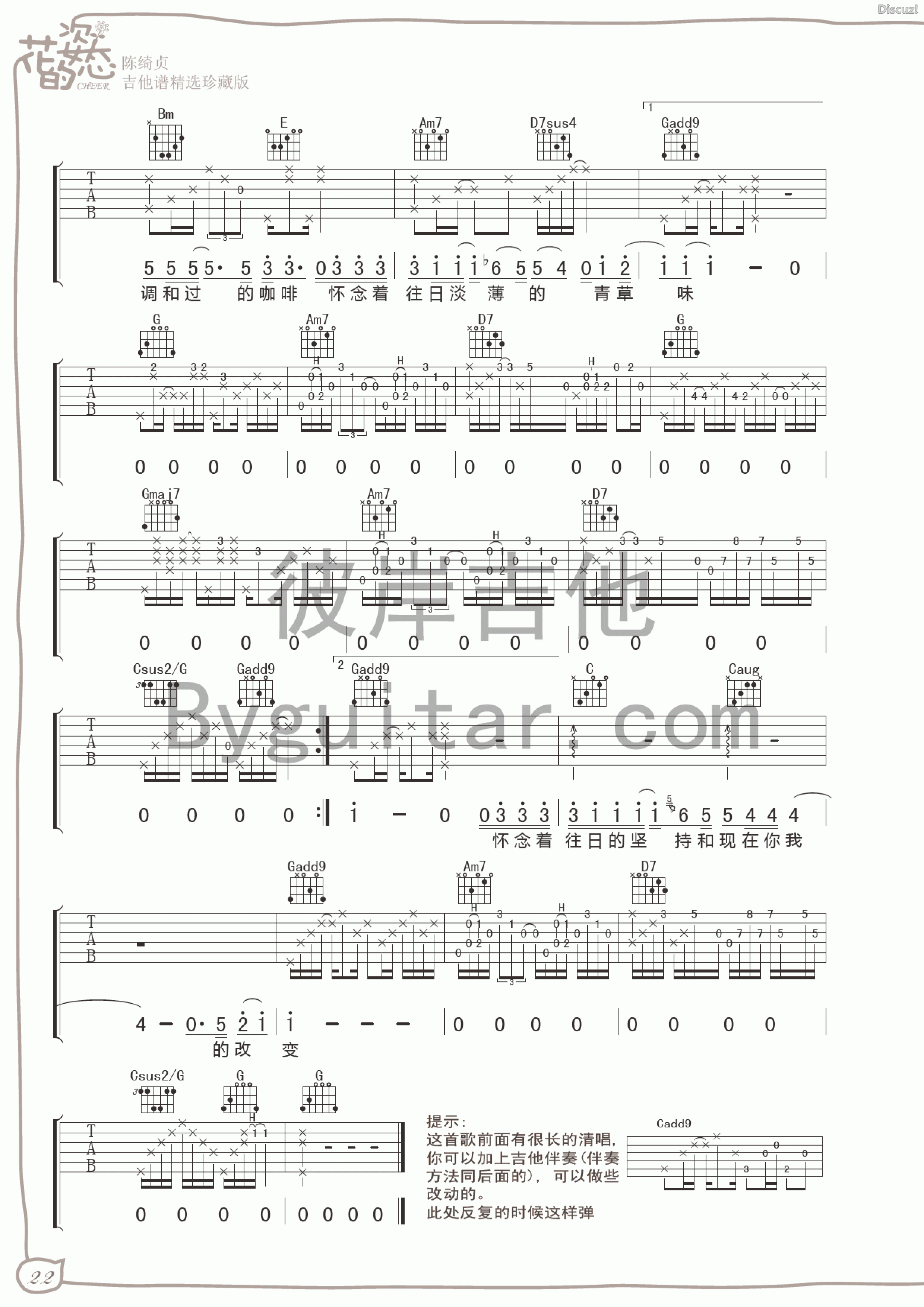 歌曲选自《陈绮贞 精选 1998-2005》专辑非常好听的弹唱曲谱,下面3张高清曲谱由吉它简谱网为大家更新分享,有喜欢吉它的朋友欢迎关注!
