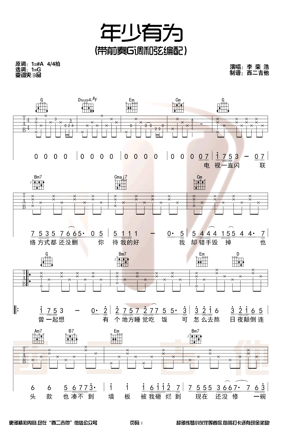 年少有为吉他谱,它是李荣浩演唱的歌曲,由西二吉他编配制谱,是一首经典歌曲编配的G调指弹编配的曲谱,