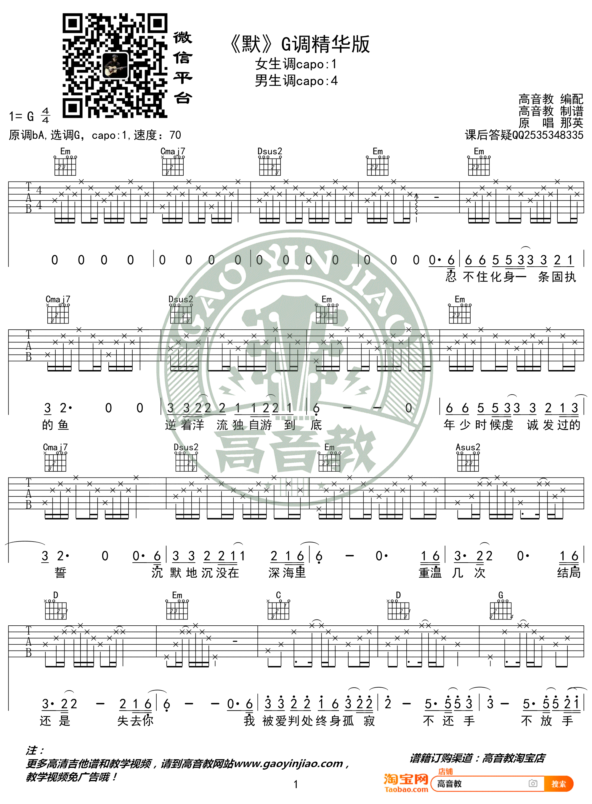 那英《默》这首歌,原调bA,选调G,CAPO夹一品。电影《何以笙箫默》主题曲,默六线谱,高清弹唱图片谱,是由高音教编配出品,是由分享。