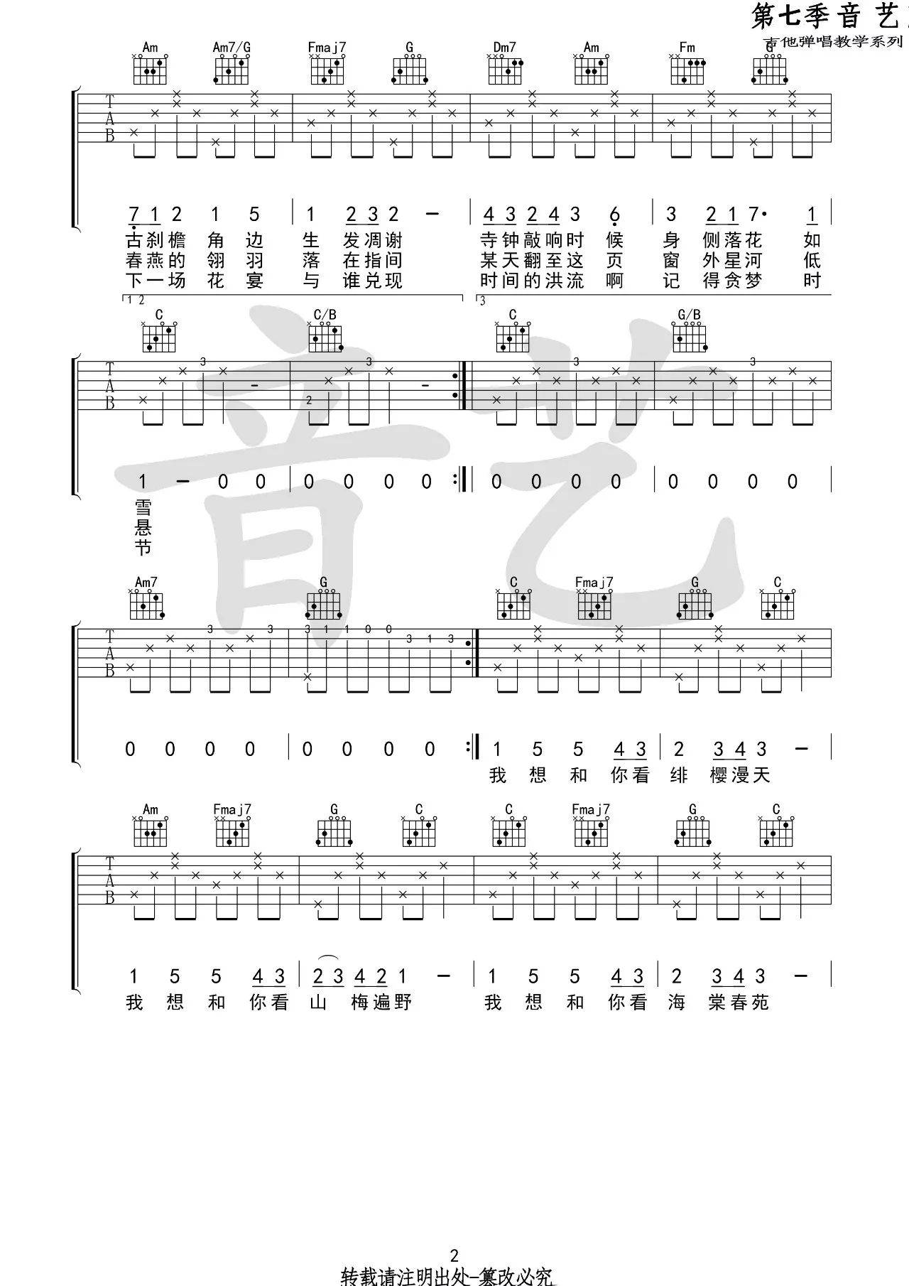 花枝春野吉他谱,原版不才歌曲,简单C调弹唱教学,音艺吉他版六线指弹简谱图