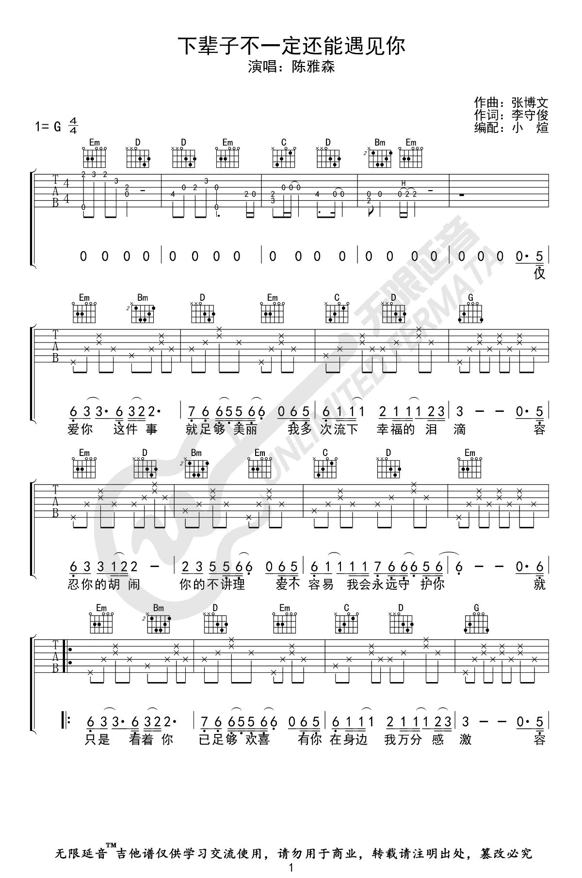 下辈子不一定还能遇见你吉他谱,原版陈雅森歌曲,简单G调弹唱教学,无限延音版六线指弹简谱图