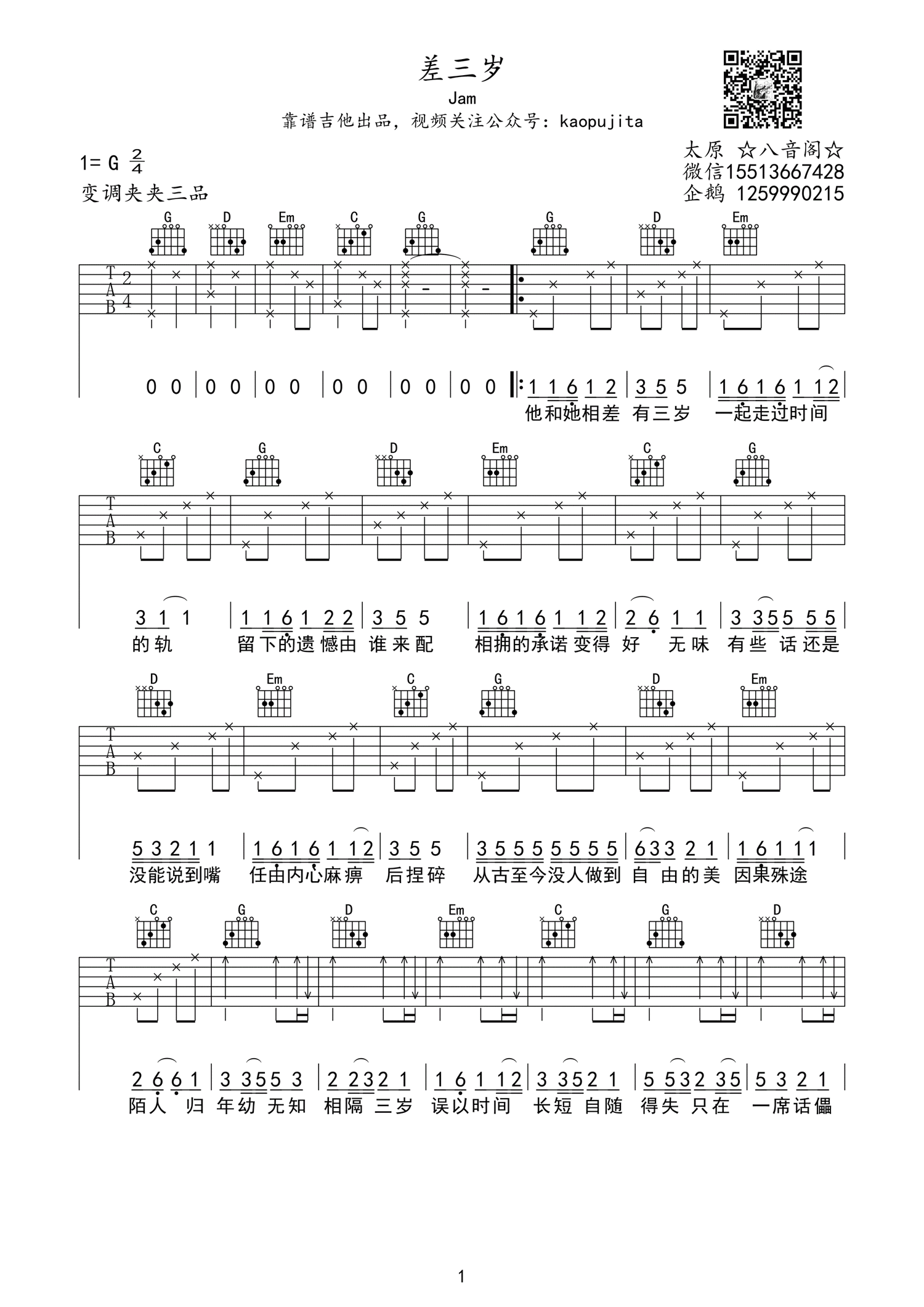 差三岁吉他谱,它是Jam演唱的歌曲,由靠谱吉他编配制谱,是一首经典歌曲编配的G调指弹编配的曲谱,
