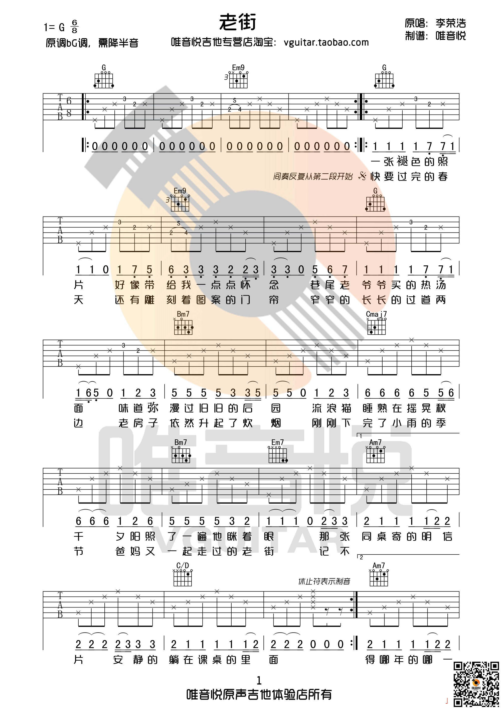 老街吉他谱,它是李荣浩演唱的歌曲,由唯音悦编配制谱,是一首经典歌曲编配的G调指弹编配的曲谱,