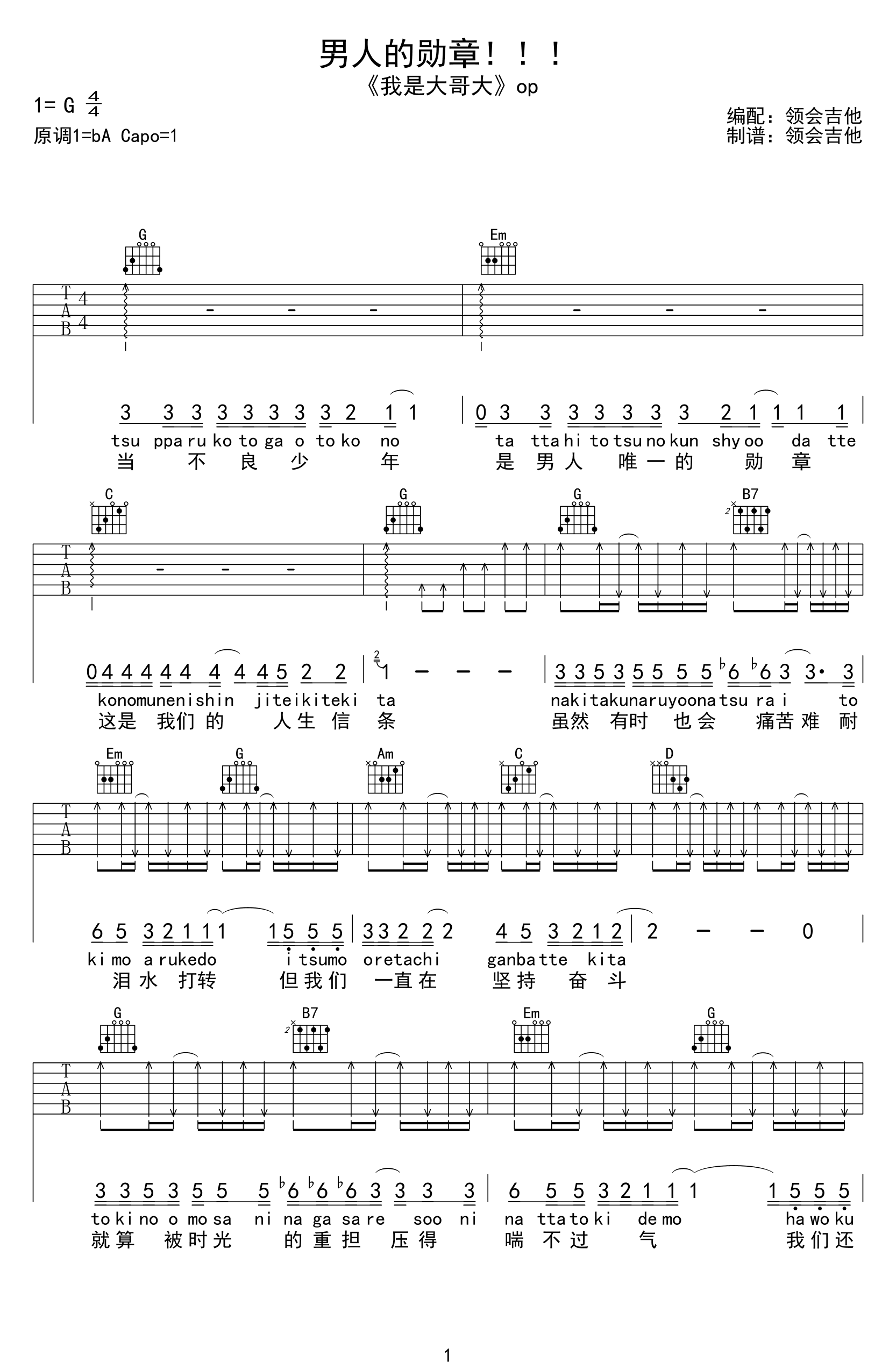 男人的勋章这首歌,带音译歌词,漫改日剧《我是大哥大》主题曲,男人の勋章六线谱,G调指法,CAPO夹一品,图片高清简谱,领会吉他编配,上传分享。