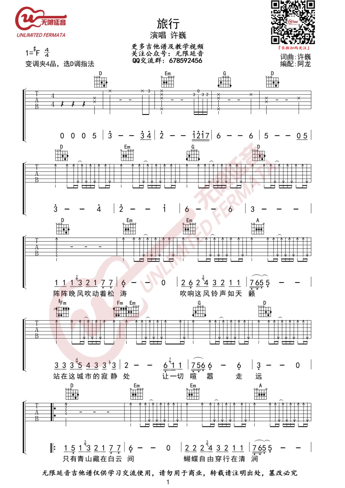 旅行吉他谱,它是许巍演唱的歌曲,由无限延音编配制谱,是一首经典歌曲编配的D调指弹编配的曲谱,