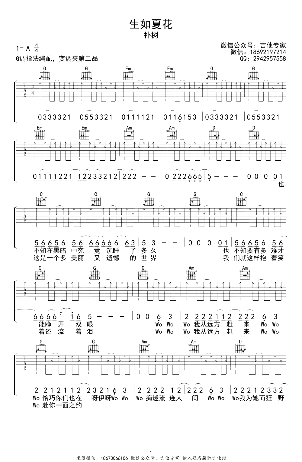 生如夏花吉他谱,取自演唱的歌曲是经典A调指弹编配的曲谱,非常好听的弹唱曲谱,下面1张高清曲谱由吉曲谱网为大家更新分享,有喜欢吉它的朋友欢迎关注!