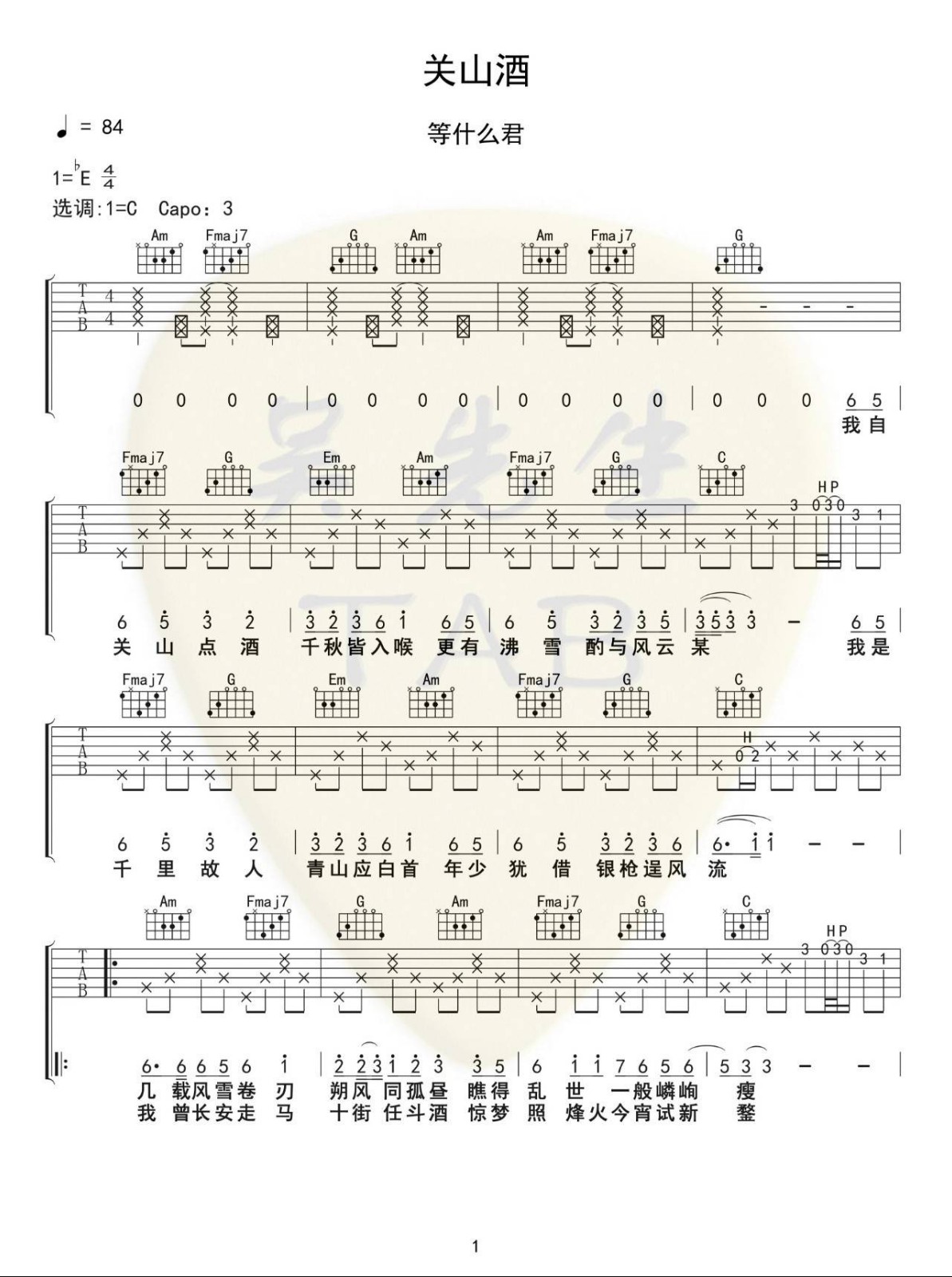 关山酒吉他谱采用C调指法,由吴先生编配。我自关山点酒,千秋皆入喉,更有沸雪酌与风云某。我是千里故人,青山应白首,年少,犹借银枪逞风流。这首歌的歌词写得十分豪迈,有一种在乱世里,与君相守。我之前看过对这首歌的评论,我曾经看到过一句特别喜欢的一句话,我倾家荡产才买了一把剑,准备喝完酒就上路,碰巧你在邻桌笑,从此心中再无江湖。你是我愿意用天下来交换的一个人,除了你,我再也不会挂念别的事情了