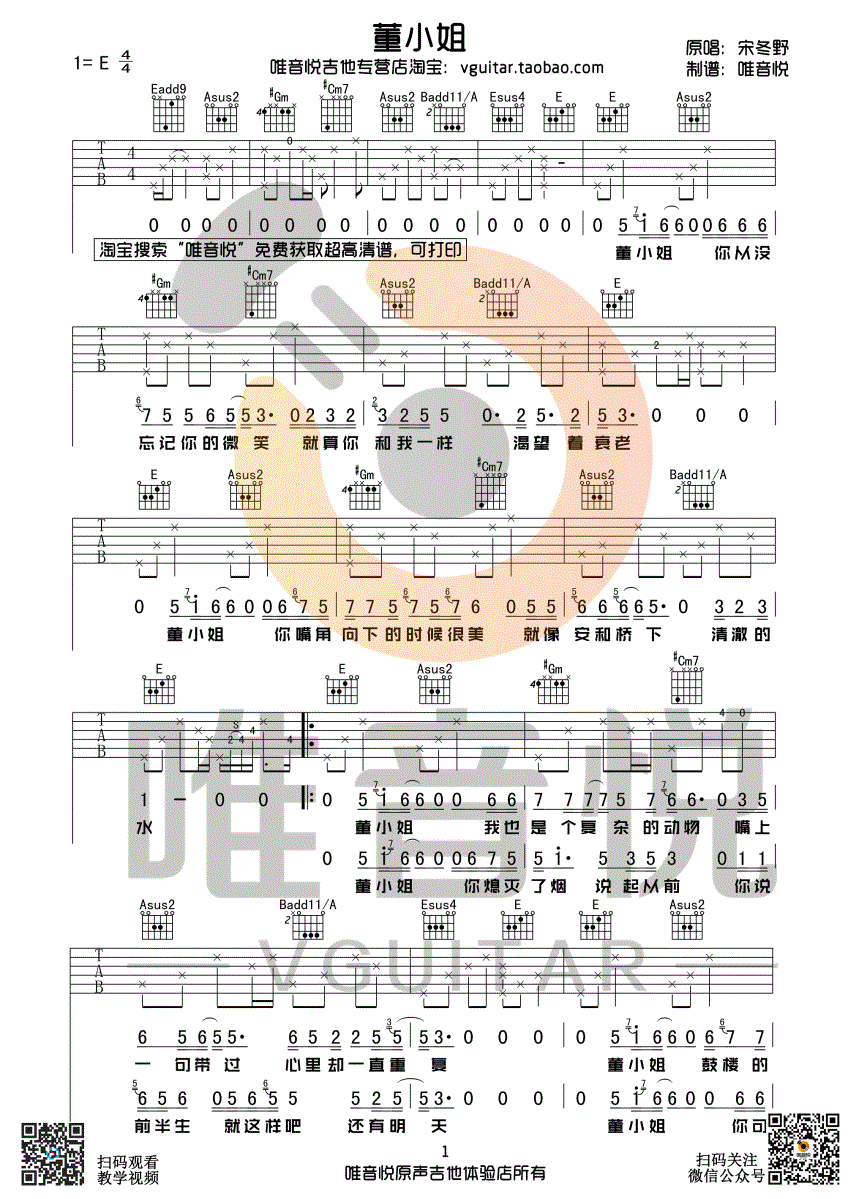 董小姐这首歌,宋冬野的经典代表作品,E调指法,三张弹唱图片谱。董小姐六线谱,唯音悦编配,上传分享。