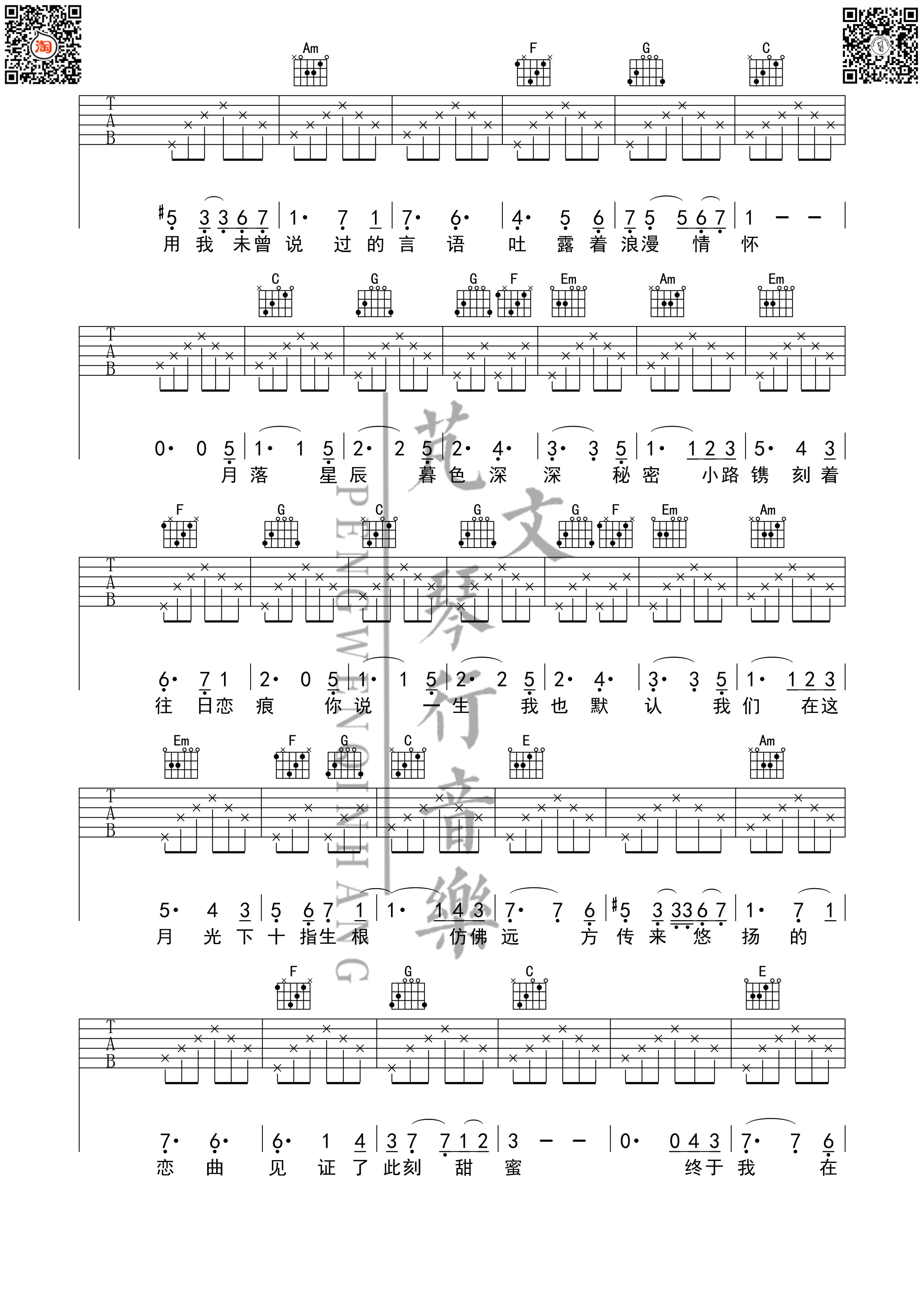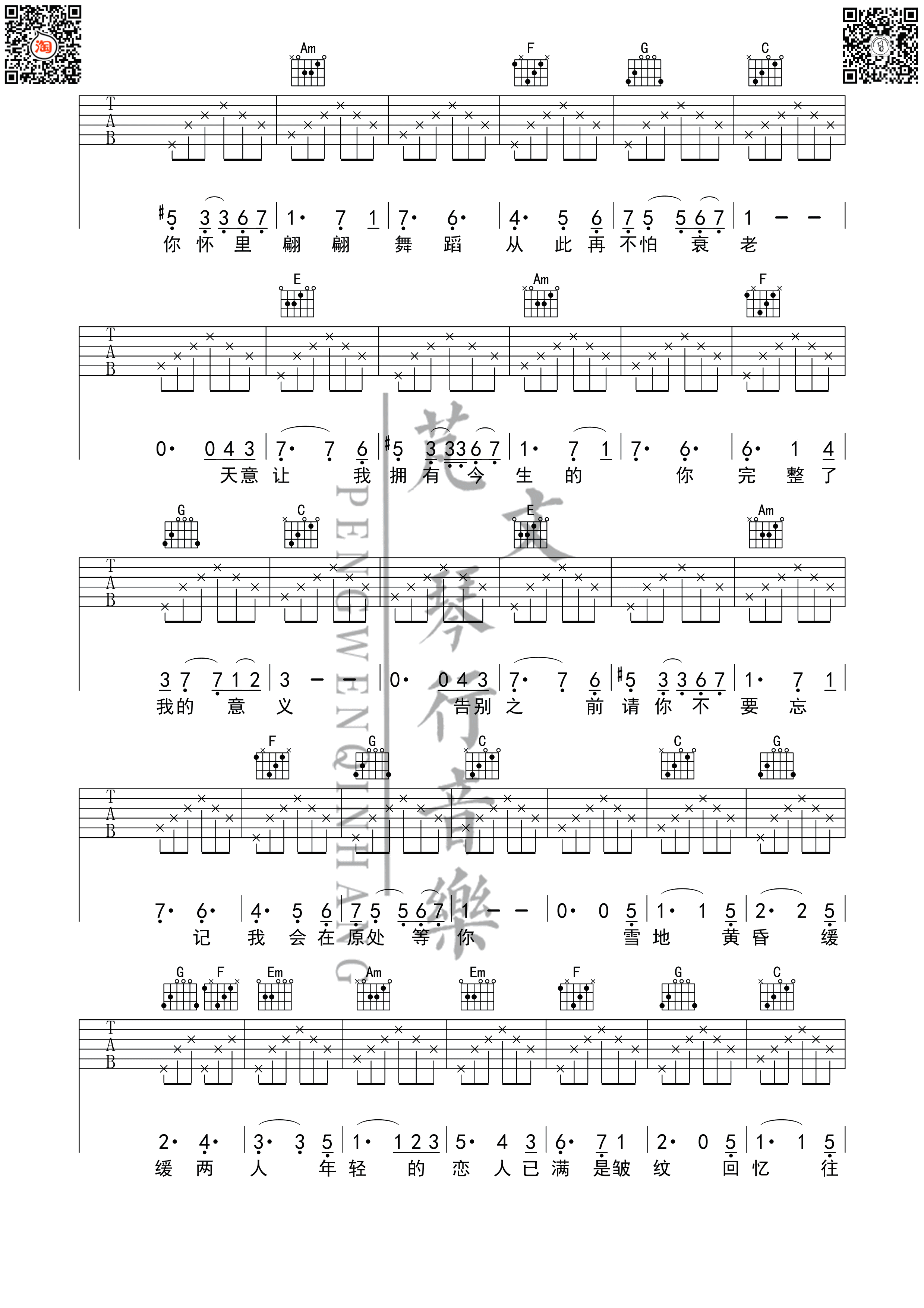芬芳一生吉他谱,它是毛不易演唱的歌曲,由芃文音乐编配制谱,是一首经典歌曲编配的F调指弹编配的曲谱,
