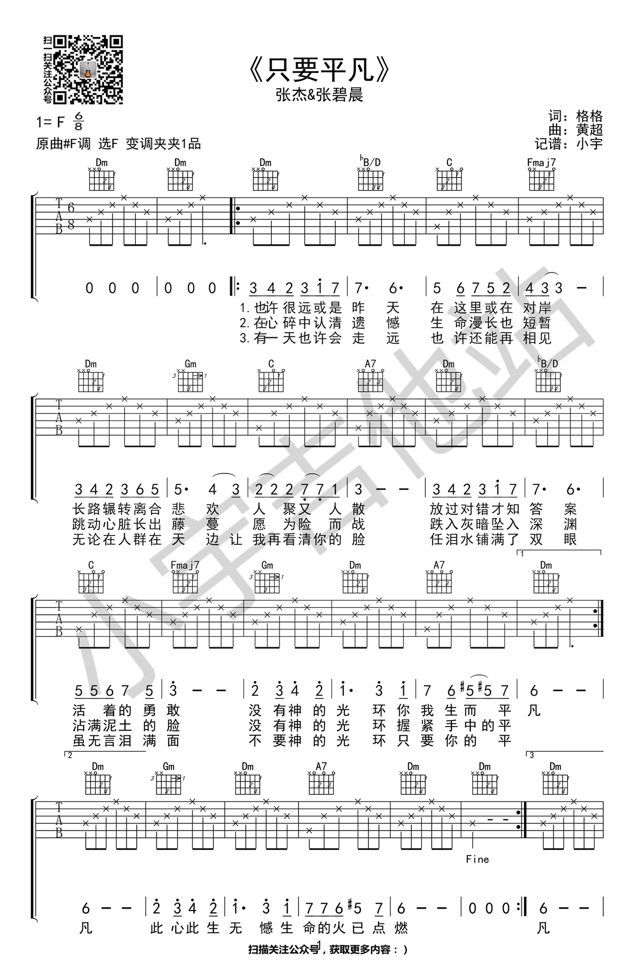 只要平凡这首歌,张杰和张碧晨共同演唱电影《我不是药神》主题曲,只要平凡六线谱,原版弹唱图片谱,原调#F,选用F调,变调夹夹1品,是由小宇吉他站的编配,。