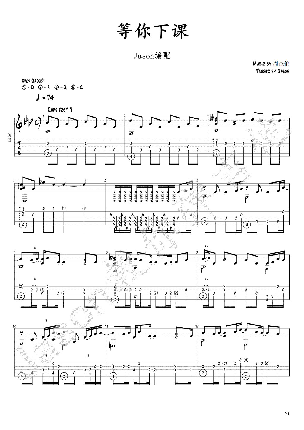 等你下课吉他指弹谱 附独奏演示教学视频_Jason编配_周杰伦等你下课吉他谱,它是周杰伦演唱的歌曲,由Jason编配制谱,是一首经典歌曲编配的"t指弹编配的曲谱,
