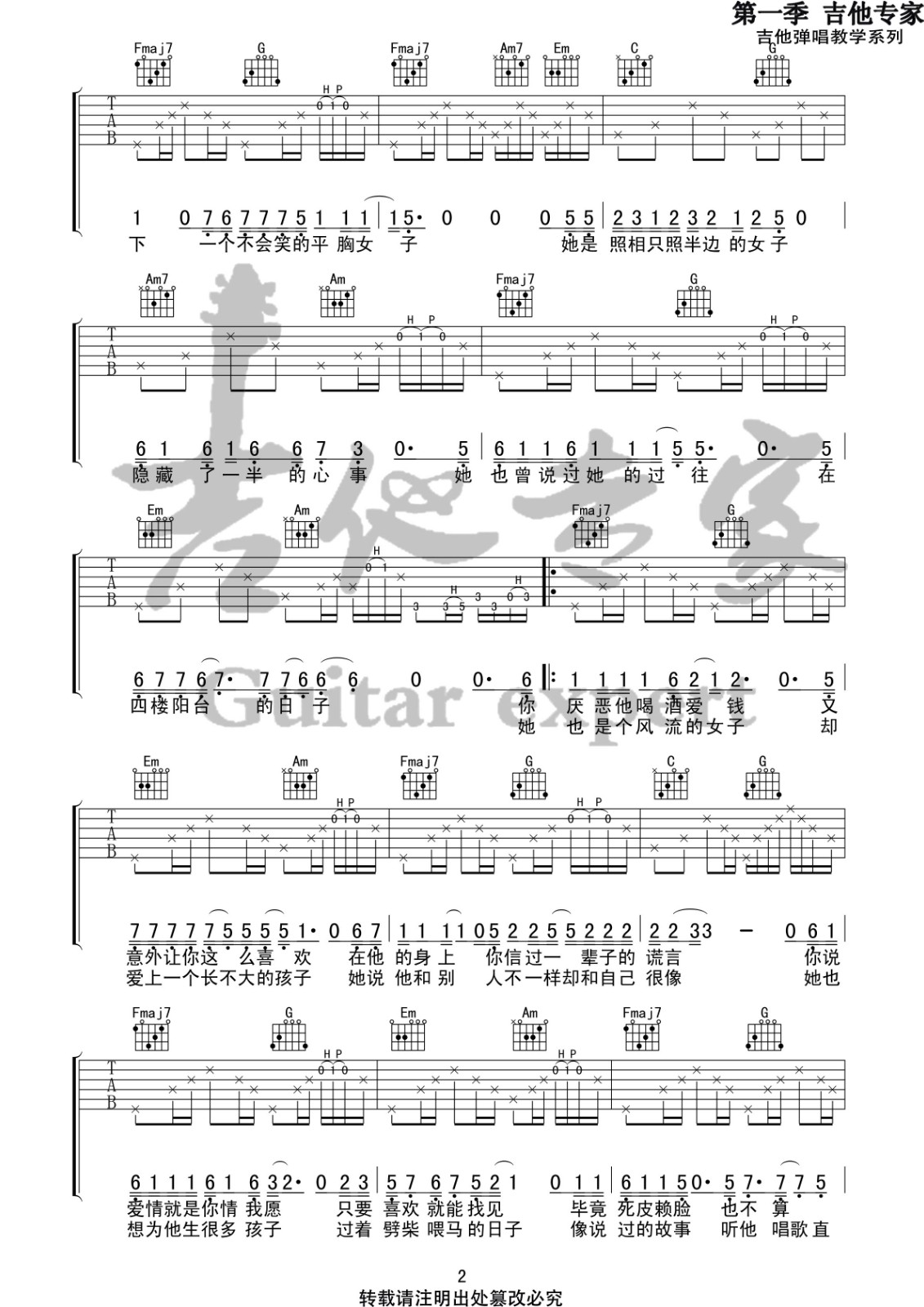 平胸女子吉他谱,它是枯木逢春演唱的歌曲,由音艺吉他编配制谱,是一首经典歌曲编配的C调指弹编配的曲谱,